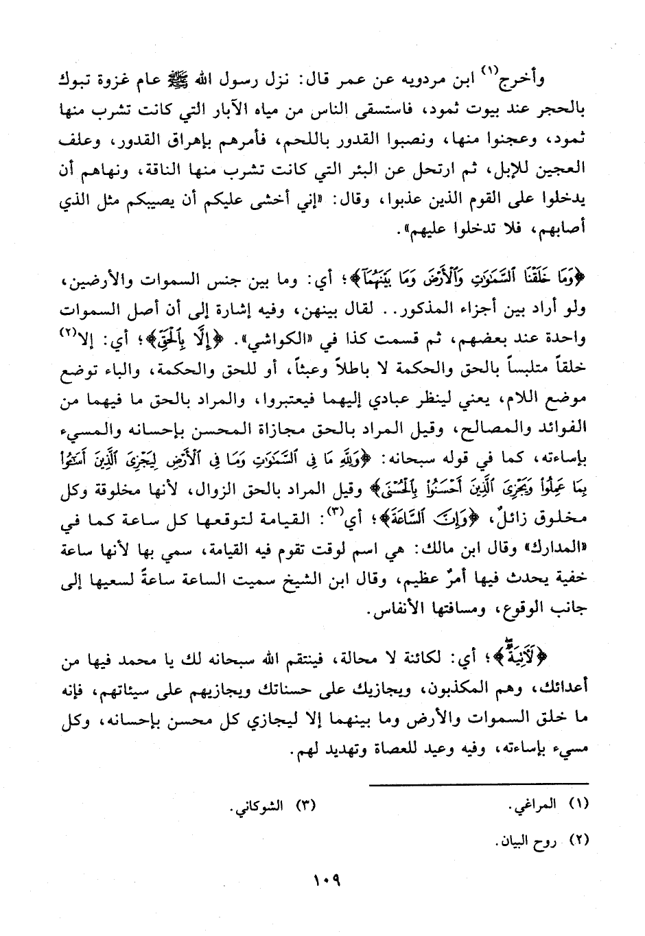 وأخرج (¬1) ابن مردويه عن عمر قال: نزل رسول الله - صلى الله عليه وسلم - عام غزوة تبوك بالحجر عند بيوت ثمود، فاستسقى الناس من مياه الآبار التي كانت تشرب منها ثمود، وعجنوا منها، ونصبوا القدور باللحم، فأمرهم بإهراق القدور، وعلف العجين للإبل، ثم ارتحل عن البئر التي كانت تشرب منها الناقة، ونهاهم أن يدخلوا على القوم الذين عذبوا، وقال: "إني أخشى عليكم أن يصيبكم مثل الذي أصابهم، فلا تدخلوا عليهم".