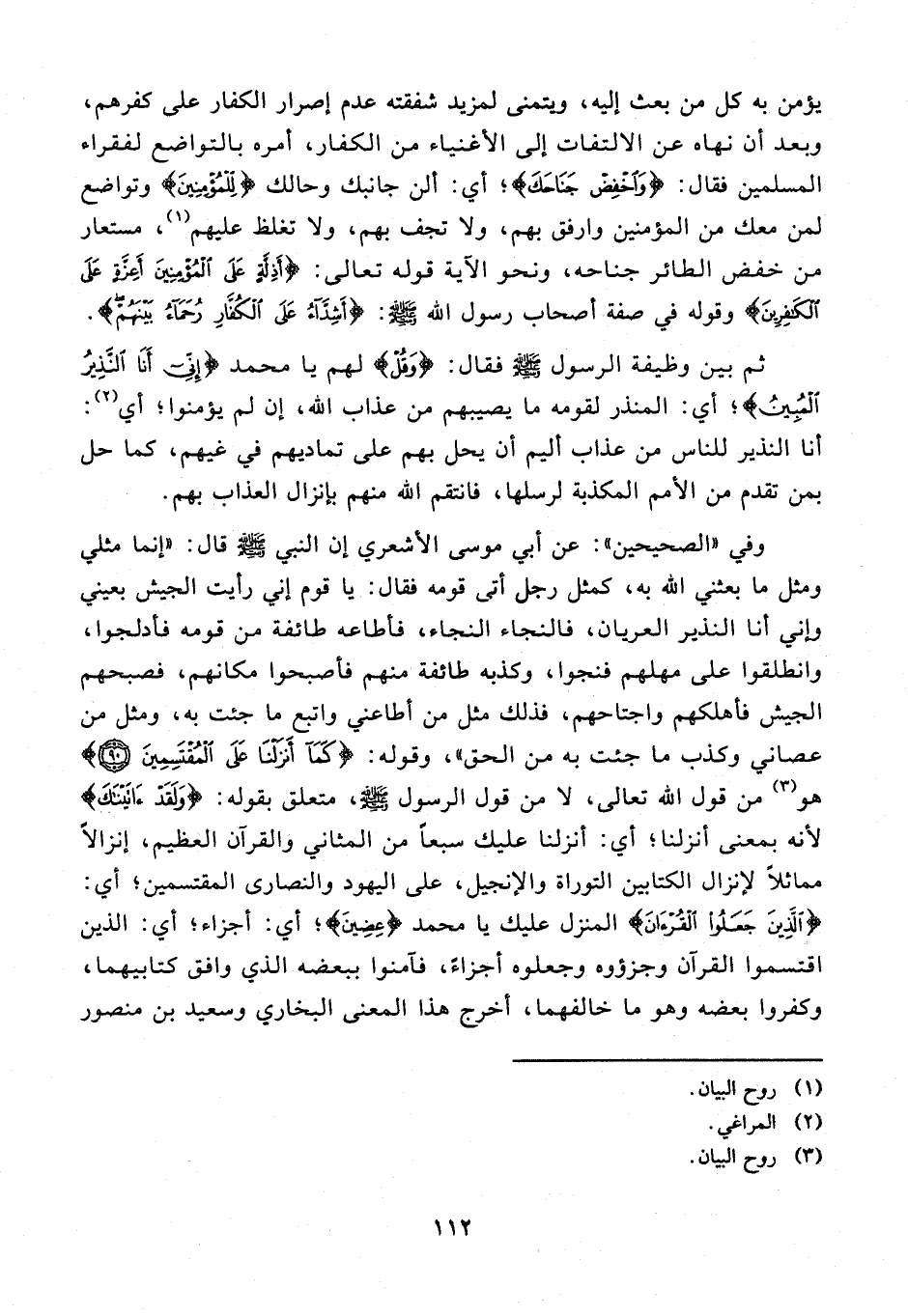89 - ثم بين وظيفة الرسول - صلى الله عليه وسلم - فقال: {وَقُلْ} لهم يا محمد {إِنِّي أَنَا النَّذِيرُ الْمُبِينُ}؛ أي: المنذر لقومه ما يصيبهم من عذاب الله، إن لم يؤمنوا؛ أي (¬2): أنا النذير للناس من عذاب أليم أن يحل بهم على تماديهم في غيهم، كما حل بمن تقدم من الأمم المكذبة لرسلها، فانتقم الله منهم لإنزال العذاب بهم.