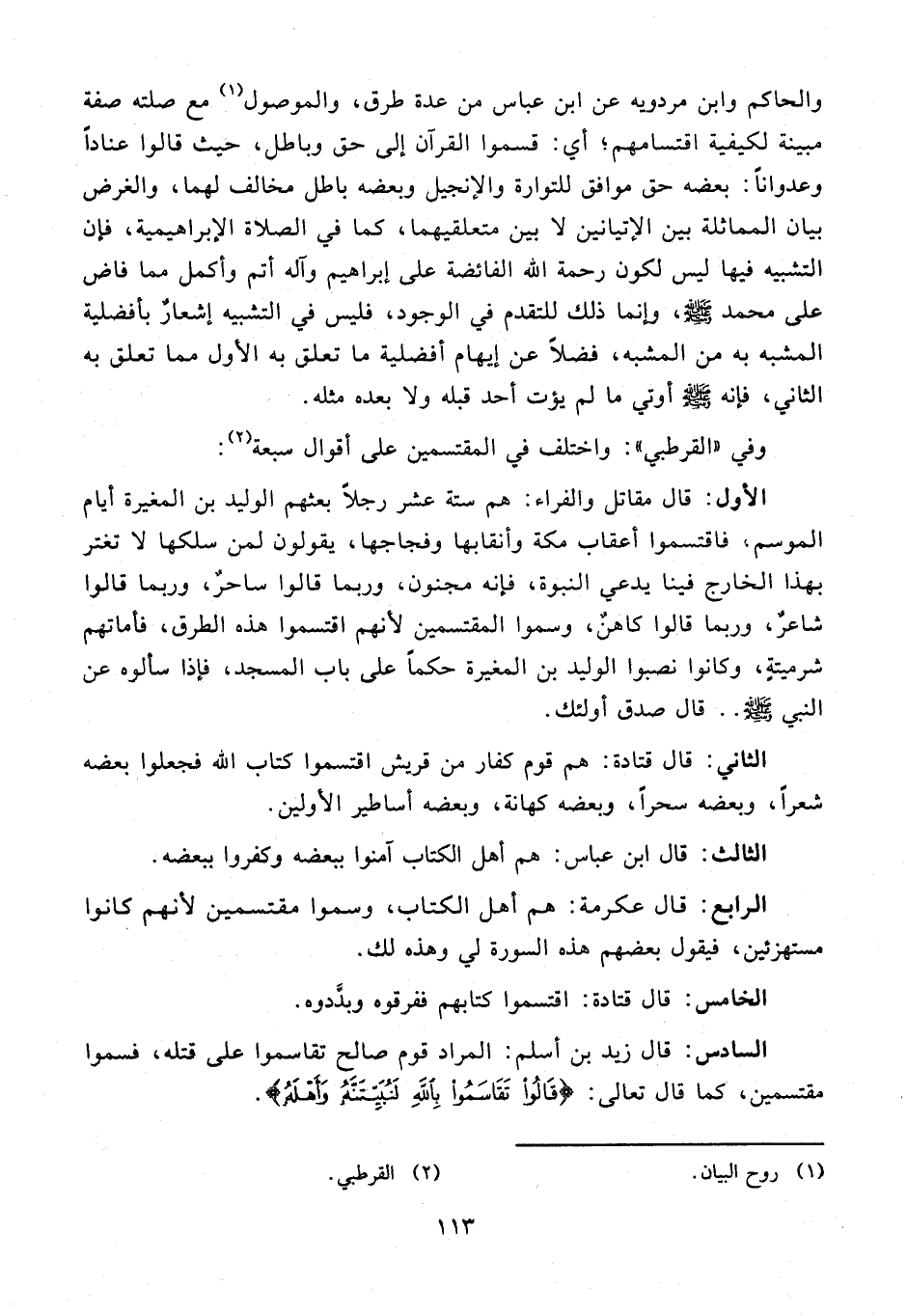 الأول: قال مقاتل والفراء: هم ستة عشر رجلًا بعثهم الوليد بن المغيرة أيام الموسم، فاقتسموا أعقاب مكة وأنقابها وفجاجها، يقولون لمن سلكها لا تغتر بهذا الخارج فينا يدعي النبوة، فإنه مجنون، وربما قالوا ساحرٌ، وربما قالوا شاعرٌ، وربما قالوا كاهنٌ، وسموا المقتسمين لأنهم اقتسموا هذه الطرق، فأماتهم شر ميتةٍ، وكانوا نصبوا الوليد بن المغيرة حكمًا على باب المسجد، فإذا سألوه عن النبي - صلى الله عليه وسلم - .. قال صدق أولئك.