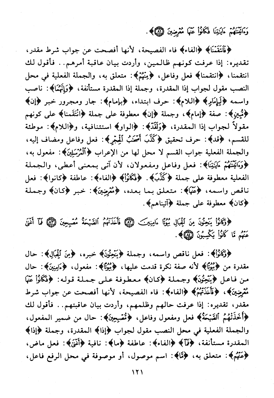 {فَانْتَقَمْنَا} {الفاء} فاء الفصيحة؛ لأنها أفصحت عن جواب شرط مقدر، تقديره: إذا عرفت كونهم ظالمين، وأردت بيان عاقبة أمرهم .. فأقول لك انتقمنا، {انتقمنا} فعل وفاعل، {مِنْهُمْ}: متعلق به، والجملة الفعلية في محل النصب مقول لجواب إذا المقدرة، وجملة إذا المقدرة مستأنفة، {وَإِنَّهُمَا}: ناصب واسمه {لَبِإِمَامٍ} {اللام}: حرف ابتداء، {بإمام}: جار ومجرور خبر {إن} {مُبِينٍ}: صفة {إمام}، وجملة {إن} معطوفة على جملة {انْتَقَمْنَا} على كونهم مقولًا لجواب إذا المقدرة، {وَلَقَدْ}: {الواو} استئنافية، و {اللام}: موطئة للقسم، {قد}: حرف تحقيق {كَذَّبَ أَصْحَابُ الْحِجْرِ}: فعل وفاعل ومضاف إليه، والجملة الفعلية جواب القسم لا محل لها من الإعراب {الْمُرْسَلِينَ}: مفعول به، {وَآتَيْنَاهُمْ آيَاتِنَا}: فعل وفاعل ومفعولان؛ لأن آتى بمعنى أعطى، والجملة الفعلية معطوفة على جملة {كَذَّبَ}. {فَكَانُوا} {الفاء}: عاطفة {كانوا}: فعل ناقص واسمه، {عَنْهَا}: متعلق بما بعده، {مُعْرِضِينَ}: خبر {كان} وجملة {كان} معطوفة على جملة {آتيناهم}.
