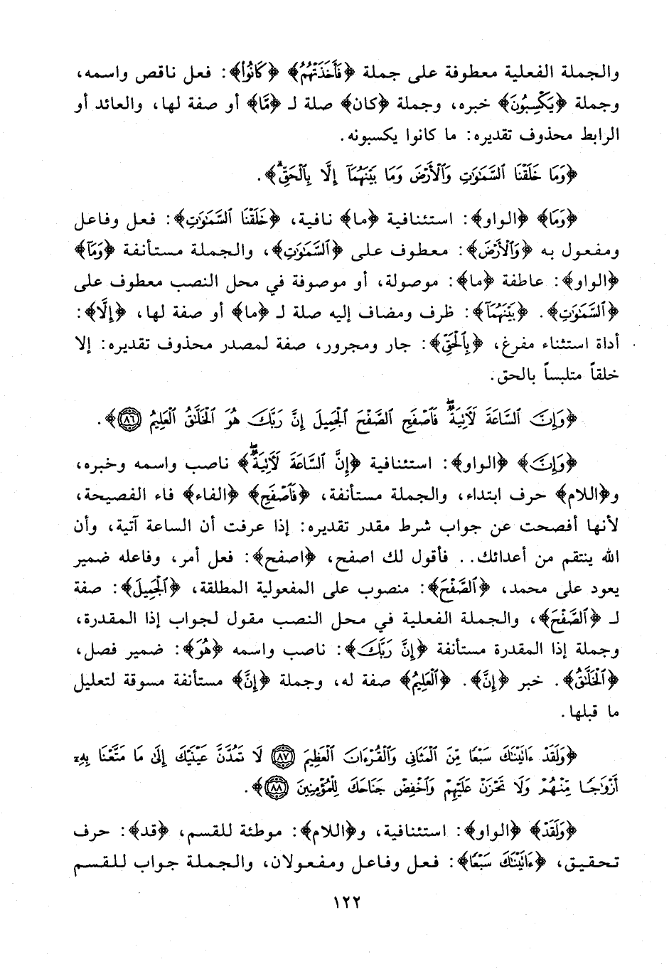{وَإِنَّ} {الواو}: استئنافية {إِنَّ السَّاعَةَ لَآتِيَةٌ} ناصب واسمه وخبره، و {اللام} حرف ابتداء، والجملة مستأنفة، {فَاصْفَحِ} {الفاء} فاء الفصيحة، لأنها أفصحت عن جواب شرط مقدر تقديره: إذا عرفت أن الساعة آتية، وأن الله ينتقم من أعدائك .. فأقول لك اصفح، {اصْفَحِ}: فعل أمر، وفاعله ضمير يعود على محمد، {الصَّفْحَ}: منصوب على المفعولية المطلقة، {الْجَمِيلَ}: صفة لـ {الصَّفْحَ}، والجملة الفعلية في محل النصب مقول لجواب إذا المقدرة، وجملة إذا المقدرة مستأنفة {إِنَّ رَبَّكَ}: ناصب واسمه {هُوَ}: ضمير فصل، {الْخَلَّاقُ}. خبر {إِنَّ}. {الْعَلِيمُ} صفة له، وجملة {إِنَّ} مستأنفة مسوقة لتعليل ما قبلها.