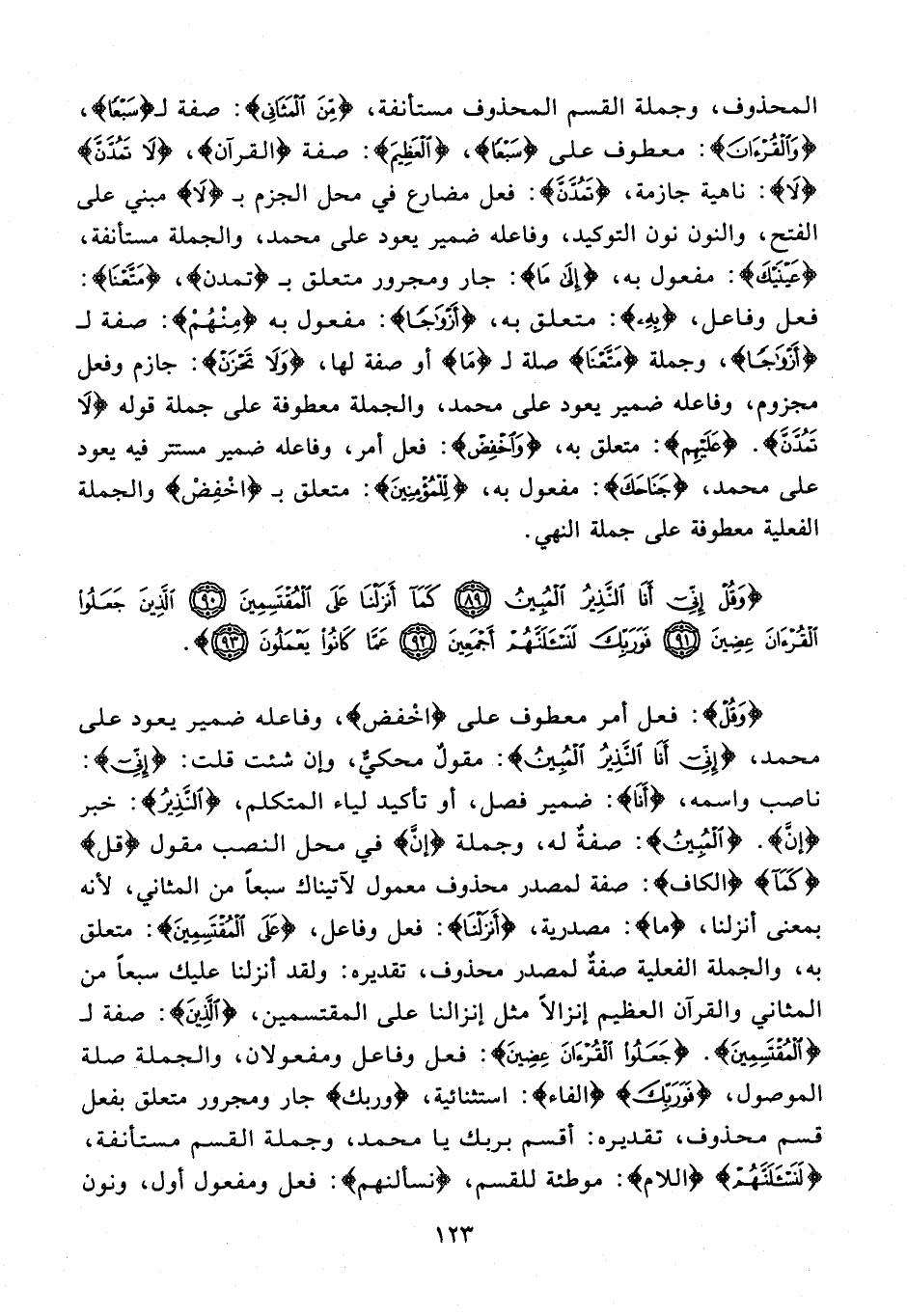 {وَقُلْ}: فعل أمر معطوف على {اخْفِضْ}، وفاعله ضمير يعود على محمد، {إِنِّي أَنَا النَّذِيرُ الْمُبِينُ}: مقولٌ محكيٌّ، وإن شئت قلت: {إِنِّي}: ناصب واسمه، {أَنَا}: ضمير فصل، أو تأكيد لياء المتكلم، {النَّذِيرُ}: خبر {إنَّ}. {الْمُبِينُ}: صفةٌ له، وجملة {إنَّ} في محل النصب مقول {قل} {كَمَا} {الكاف}: صفة لمصدر محذوف معمول لآتيناك سبعًا من المثاني؛ لأنه بمعنى أنزلنا، {ما}: مصدرية، {أَنْزَلْنَا}: فعل وفاعل، {عَلَى الْمُقْتَسِمِينَ}: متعلق به، والجملة الفعلية صفةٌ لمصدر محذوف، تقديره: ولقد أنزلنا عليك سبعًا من المثاني والقرآن العظيم إنزالًا مثل إنزالنا على المقتسمين، {الَّذِينَ}: صفة لـ {الْمُقْتَسِمِينَ}. {جَعَلُوا الْقُرْآنَ عِضِينَ}: فعل وفاعل ومفعولان، والجملة صلة الموصول، {فَوَرَبِّكَ} {الفاء}: استثنائية، {وربك} جار ومجرور متعلق بفعل قسم محذوف، تقديره: أقسم بربك يا محمد، وجملة القسم مستأنفة، {لَنَسْأَلَنَّهُمْ} {اللام}: موطئة للقسم، {نسألنهم}: فعل ومفعول أول، ونون
