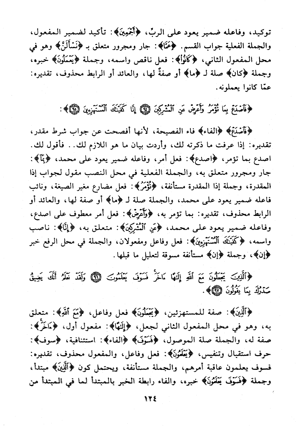 {فَاصْدَعْ} الفاء فاء الفصيحة، لأنها أفصحت عن جواب شرط مقدر، تقديره: إذا عرفت ما ذكرته لك، وأردت بيان ما هو اللازم لك .. فأقول لك. اصدع بما تؤمر، {اصدع}: فعل أمر، وفاعله ضمير يعود على محمدٍ، {بِمَا}: جار ومجرور متعلق به، والجملة الفعلية في محل النصب مقول لجواب إذا المقدرة، وجملة إذا المقدرة مستأنفة، {تُؤْمَرُ}: فعل مضارع مغير الصيغة، ونائب فاعله ضمير يعود على محمد، والجملة صلة لـ {ما} أو صفة لها، والعائد أو الرابط محذوف، تقديره: بما تؤمر به، {وَأَعْرِضْ}: فعل أمر معطوف على اصدع، وفاعله ضمير يعود على محمد، {عَنِ الْمُشْرِكِينَ}: متعلق به، {إِنَّا}: ناصب واسمه، {كَفَيْنَاكَ الْمُسْتَهْزِئِينَ}: فعل وفاعل ومفعولان، والجملة في محل الرفع خبر {إن}، وجملة {إن} مستأنفة مسوقة لتعليل ما قبلها.