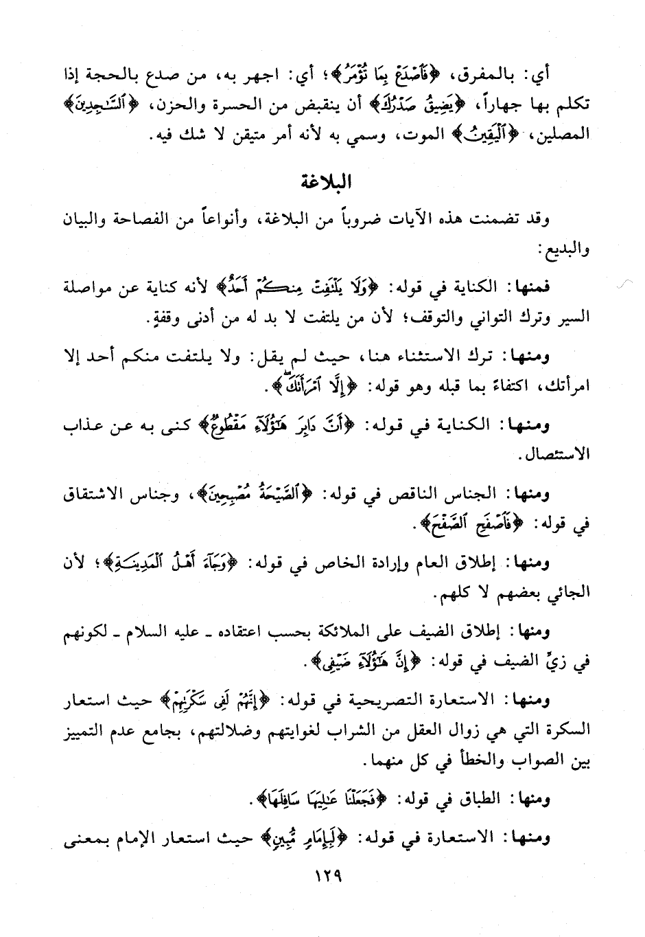 أي: بالمفرق، {فَاصْدَعْ بِمَا تُؤْمَرُ}؛ أي: اجهر به، من صدع بالحجة إذا تكلم بها جهارًا، {يَضِيقُ صَدْرُكَ} أن ينقبض من الحسرة والحزن، {السَّاجِدِينَ} المصلين، {الْيَقِينُ} الموت، وسمي به لأنه أمر متيقن لا شك فيه.