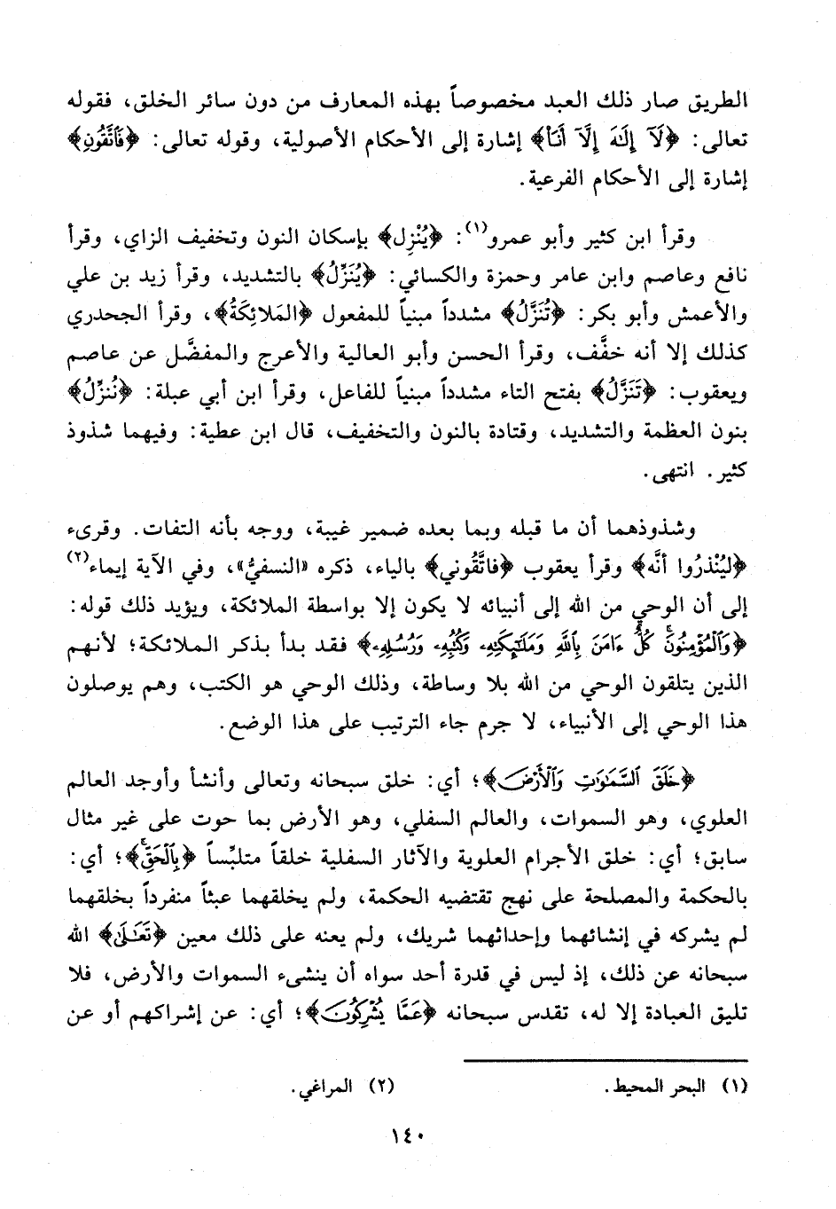 وقرأ ابن كثير وأبو عمرو (¬1): {يُنَزِّلُ} بإسكان النون وتخفيف الزاي، وقرأ نافع وعاصم وابن عامر وحمزة والكسائي: {يُنَزِّلُ} بالتشديد، وقرأ زيد بن علي والأعمش وأبو بكر: {تُنَزَّلُ} مشددًا مبنيًّا للمفعول {المَلائِكَةُ}، وقرأ الجحدري كذلك إلا أنه خفَّف، وقرأ الحسن وأبو العالية والأعرج والمفضَّل عن عاصم ويعقوب: {تَنَزَّلُ} بفتح التاء مشددًا مبنيًّا للفاعل، وقرأ ابن أبي عبلة: {نُنزِّلُ} بنون العظمة والتشديد، وقتادة بالنون والتخفيف، قال ابن عطية: وفيهما شذوذ كثير. انتهى.