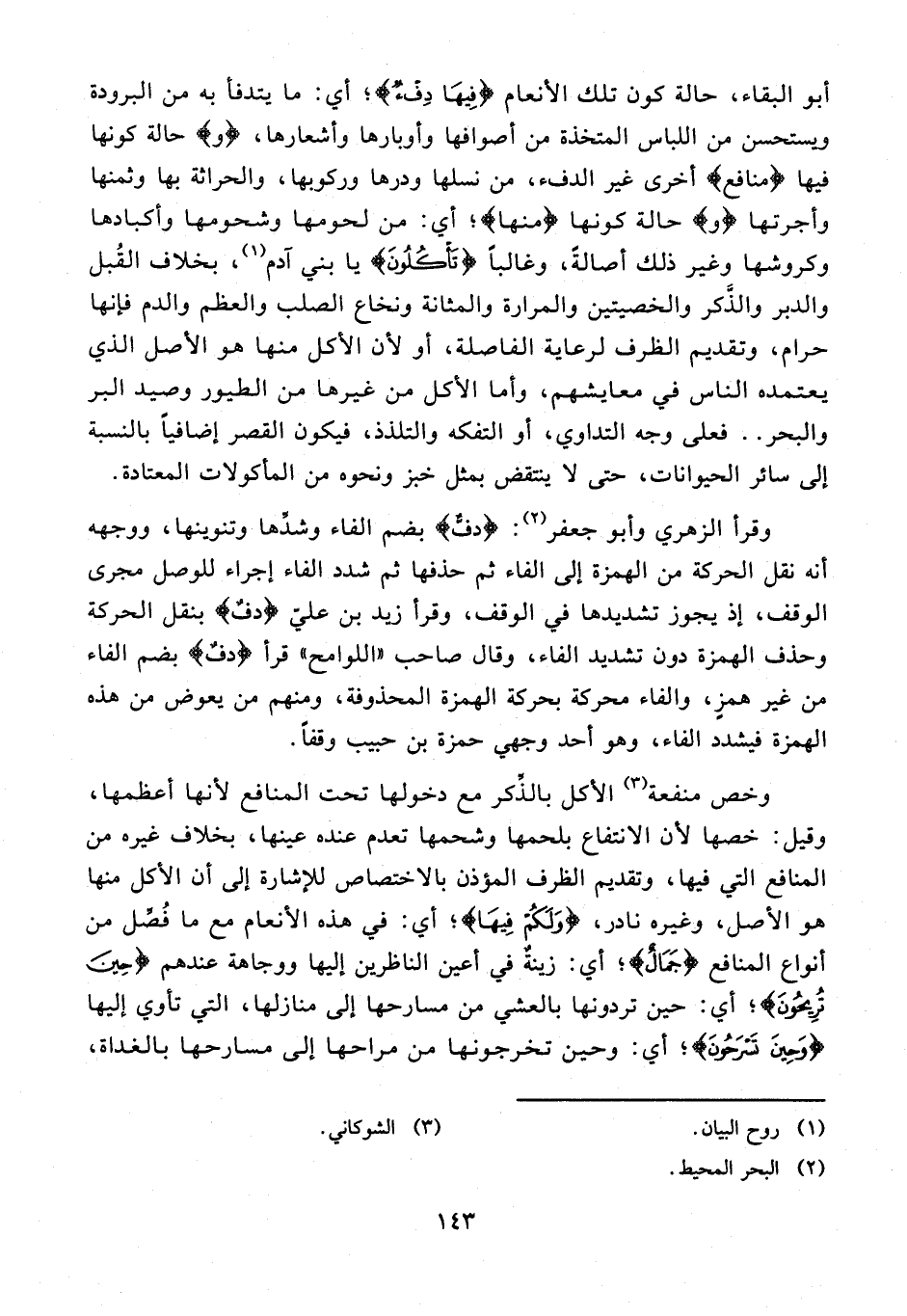 أبو البقاء، حالة كون تلك الأنعام {فِيهَا دِفْءٌ}؛ أي: ما يتدفأ به من البرودة ويستحسن من اللباس المتخذة من أصوافها وأوبارها وأشعارها، {و} حالة كونها فيها {منافع} أخرى غير الدفء، من نسلها ودرها وركوبها، والحراثة بها وثمنها وأجرتها {و} حالة كونها {منها}؛ أي: من لحومها وشحومها وأكبادها وكروشها وغير ذلك أصالةً، وغالبًا {تَأْكُلُونَ} يا بني آدم (¬1)، بخلاف القُبل والدبر والذَّكر والخصيتين والمرارة والمثانة ونخاع الصلب والعظم والدم فإنها حرام، وتقديم الظرف لرعاية الفاصلة، أو لأن الأكل منها هو الأصل الذي يعتمده الناس في معايشهم، وأما الأكل من غيرها من الطيور وصيد البر والبحر .. فعلى وجه التداوي، أو التفكه والتلذذ، فيكون القصر إضافيًّا بالنسبة إلى سائر الحيوانات، حتى لا ينتقض بمثل خبز ونحوه من المأكولات المعتادة.