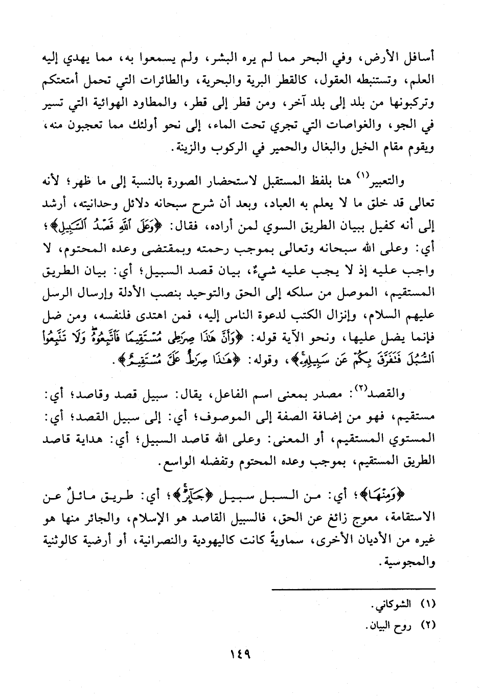 9 - وبعد أن شرح سبحانه دلائل وحدانيته، أرشد إلى أنه كفيل ببيان الطريق السوي لمن أراده، فقال: {وَعَلَى اللَّهِ قَصْدُ السَّبِيلِ}؛ أي: وعلى الله سبحانه وتعالى بموجب رحمته وبمقتضى وعده المحتوم، لا واجب عليه إذ لا يجب عليه شيءٌ، بيان قصد المسبيل؛ أي: بيان الطريق المستقيم، الموصل من سلكه إلى الحق والتوحيد بنصب الأدلة وإرسال الرسل عليهم السلام، وإنزال الكتب لدعوة الناس إليه، فمن اهتدى فلنفسه، ومن ضل فإنما يضل عليها، ونحو الآية قوله: {وَأَنَّ هَذَا صِرَاطِي مُسْتَقِيمًا فَاتَّبِعُوهُ وَلَا تَتَّبِعُوا السُّبُلَ فَتَفَرَّقَ بِكُمْ عَنْ سَبِيلِهِ}، وقوله: {هَذَا صِرَاطٌ عَلَيَّ مُسْتَقِيمٌ}.