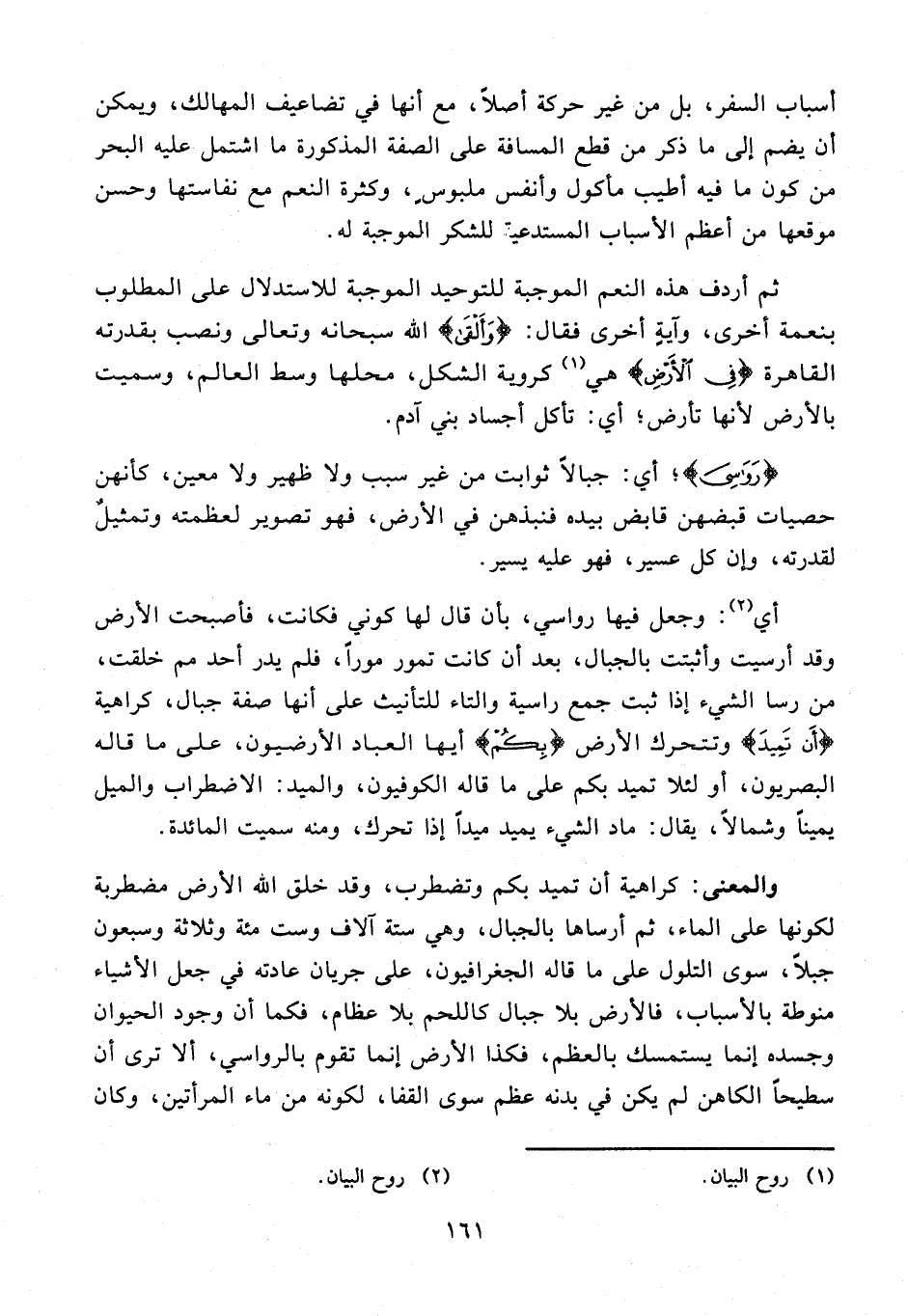 والمعنى: كراهية أن تميد بكم وتضطرب، وقد خلق الله الأرض مضطربة لكونها على الماء، ثم أرساها بالجبال، وهي ستة آلاف وست مئة وثلاثة وسبعون جبلًا، سوى التلول على ما قاله الجغرافيون، على جريان عادته في جعل الأشياء منوطة بالأسباب، فالأرض بلا جبال كاللحم بلا عظام، فكما أن وجود الحيوان وجسده إنما يستمسك بالعظم، فكذا الأرض إنما تقوم بالرواسي، ألا ترى أن سطيحًا الكاهن لم يكن في بدنه عظم سوى القفا، لكونه من ماء المرأتين، وكان