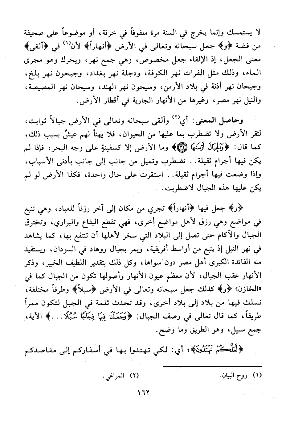 لا يستمسك وإنما يخرج في السنة مرة ملفوفًا في خرقة، أو موضوعًا على صحيفة من فضة {و} جعل سبحانه وتعالى في الأرض {أنهارًا} لأن (¬1) في {ألقى} معنى الجعل، إذ الإلقاء جعل مخصوص، وهي جمع نهر، ويحرك وهو مجرى الماء، وذلك مثل الفرات نهر الكوفة، ودجلة نهر بغداد، وجيحون نهر بلخ، وجيحان نهر أذنة في بلاد الأرمن، وسيحون نهر الهند، وسيحان نهر المصيصة، والنيل نهر مصر، وغيرها من الأنهار الجارية في أقطار الأرض.