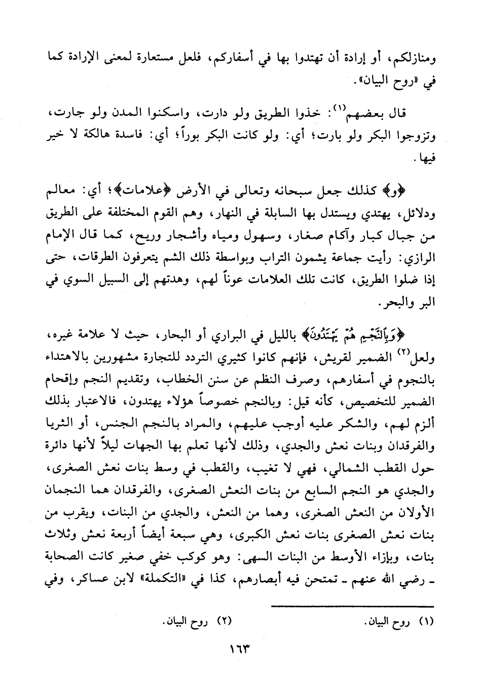 16 - {و} كذلك جعل سبحانه وتعالى في الأرض {علامات}؛ أي: معالم ودلائل، يهتدي ويستدل بها السابلة في النهار، وهم القوم المختلفة على الطريق من جبال كبار وآكام صغار، وسهول ومياه وأشجار وريح، كما قال الإِمام الرازي: رأيت جماعة يشمون التراب وبواسطة ذلك الشم يتعرفون الطرقات، حتى إذا ضلوا الطريق، كانت تلك العلامات عونًا لهم، وهدتهم إلى السبيل السوي في البر والبحر.