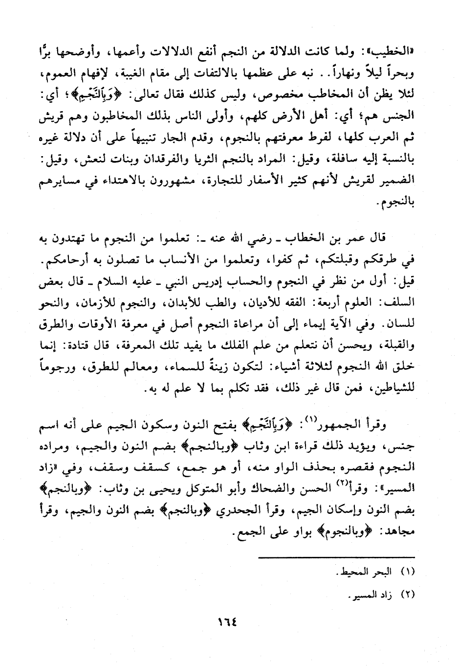 قال عمر بن الخطاب - رضي الله عنه -: تعلموا من النجوم ما تهتدون به في طرقكم وقبلتكم، ثم كفوا، وتعلموا من الأنساب ما تصلون به أرحامكم. قيل: أول من نظر في النجوم والحساب إدريس النبي - عليه السلام - قال بعض السلف: العلوم أربعة: الفقه للأديان، والطب للأبدان، والنجوم للأزمان، والنحو للسان. وفي الآية إيماء إلى أن مراعاة النجوم أصل في معرفة الأوقات والطرق والقبلة، ويحسن أن نتعلم من علم الفلك ما يفيد تلك المعرفة، قال قتادة: إنما خلق الله النجوم لثلاثة أشياء: لتكون زينةً للسماء، ومعالم للطرق، ورجومًا للشياطين، فمن قال غير ذلك، فقد تكلم بما لا علم له به.
