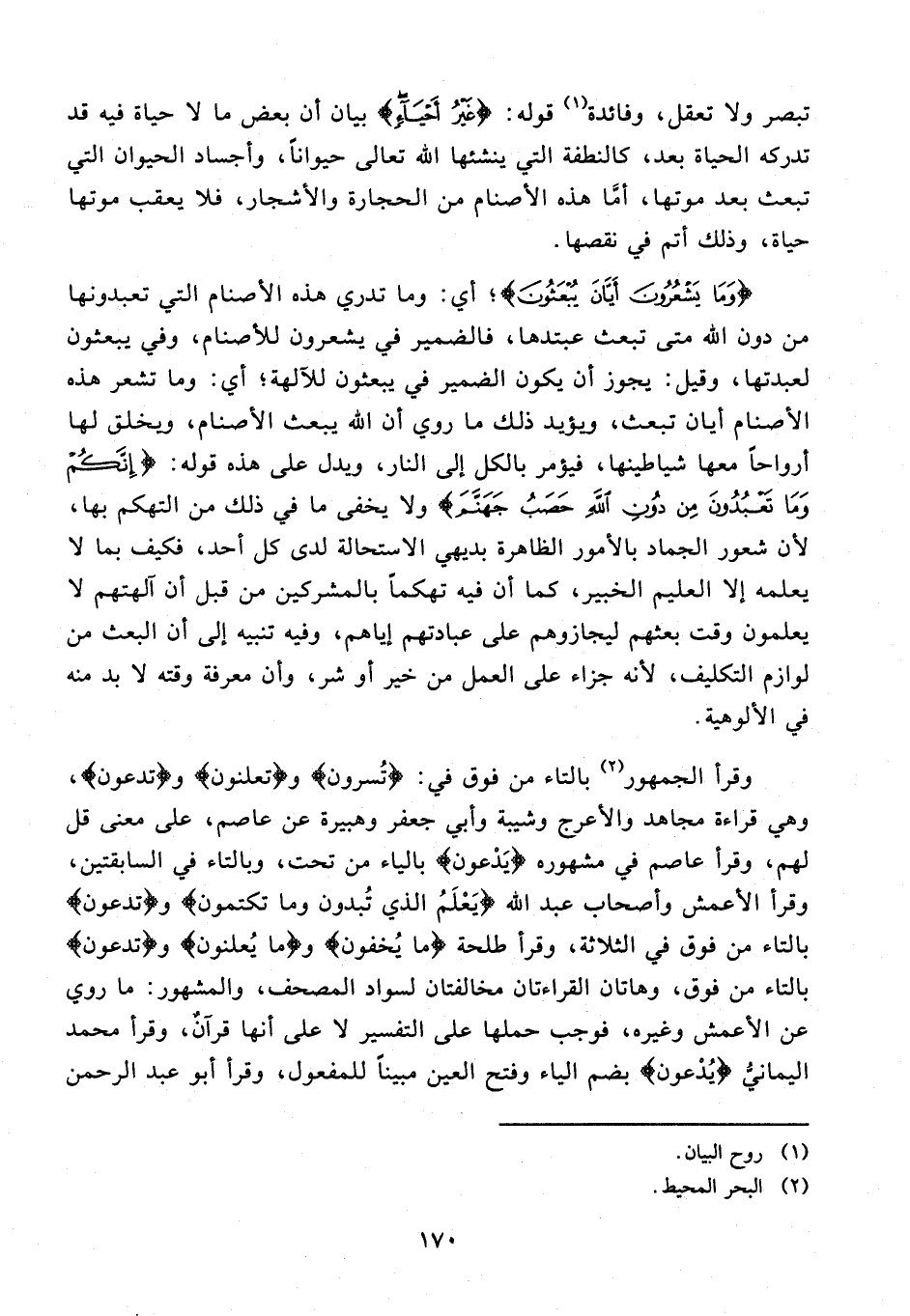 تبصر ولا تعقل، وفائدة (¬1) قوله: {غَيْرُ أَحْيَاءٍ} بيان أن بعض ما لا حياة فيه قد تدركه الحياة بعد، كالنطفة التي ينشئها الله تعالى حيوانًا، وأجساد الحيوان التي تبعث بعد موتها، أما هذه الأصنام من الحجارة والأشجار، فلا يعقب موتها حياة، وذلك أتم في نقصها.
