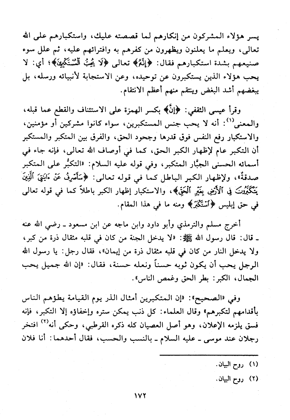 وقرأ عيسى الثقفي: {إنَّ} بكسر الهمزة على الاستئناف والقطع عما قبله، والمعنى (¬1): أنه لا يحب جنس المستكبرين، سواء كانوا مشركين أو مؤمنين، والاستكبار رفع النفس فوق قدرها وجحود الحق، والفرق بين المتكبر والمستكبر أن التكبر عام لإظهار الكبر الحق، كما في أوصاف الله تعالى، فإنه جاء في أسمائه الحسنى الجبَّار المتكبر، وفي قوله عليه السلام: "التكبُّر على المتكبر صدقةٌ"، ولإظهار الكبر الباطل كما في قوله تعالى: {سَأَصْرِفُ عَنْ آيَاتِيَ الَّذِينَ يَتَكَبَّرُونَ فِي الْأَرْضِ بِغَيْرِ الْحَقِّ}، والاستكبار إظهار الكبر باطلًا كما في قوله تعالى في حق إبليس {اسْتَكْبَرَ} ومنه ما في هذا المقام.