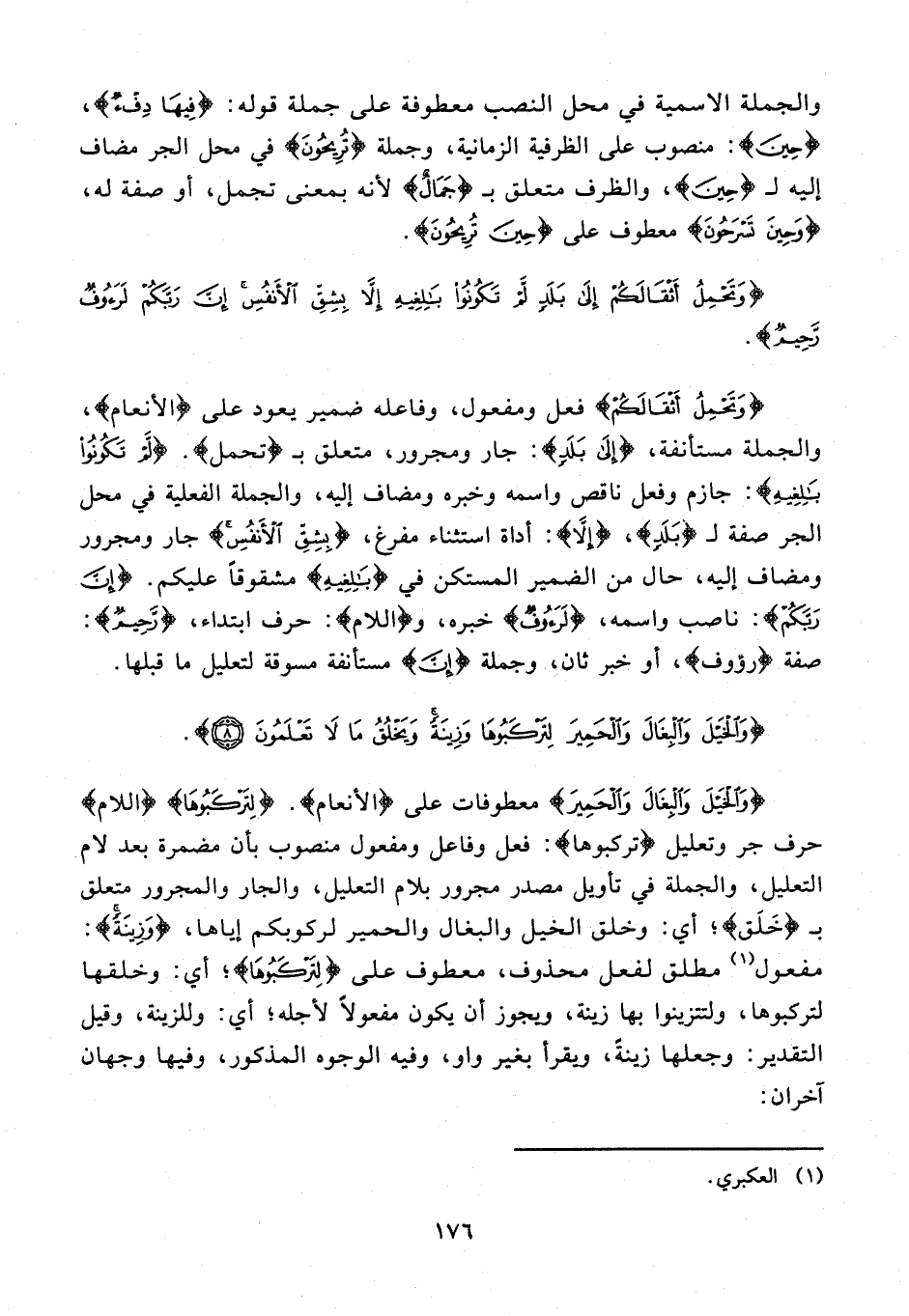 {وَالْخَيْلَ وَالْبِغَالَ وَالْحَمِيرَ} معطوفات على {الأنعام}. {لِتَرْكَبُوهَا} {اللام} حرف جر وتعليل {تركبوها}: فعل وفاعل ومفعول منصوب بأن مضمرة بعد لام التعليل، والجملة في تأويل مصدر مجرور بلام التعليل، والجار والمجرور متعلق بـ {خَلَق}؛ أي: وخلق الخيل والبغال والحمير لركوبكم إياها، {وَزِينَةً}: مفعول (¬1) مطلق لفعل محذوف، معطوف على {لِتَرْكَبُوهَا}؛ أي: وخلقها لتركبوها، ولتتزينوا بها زينة، ويجوز أن يكون مفعولًا لأجله؛ أي: وللزينة، وقيل التقدير: وجعلها زينةً، ويقرأ بغير واو، وفيه الوجوه المذكور، وفيها وجهان آخران: