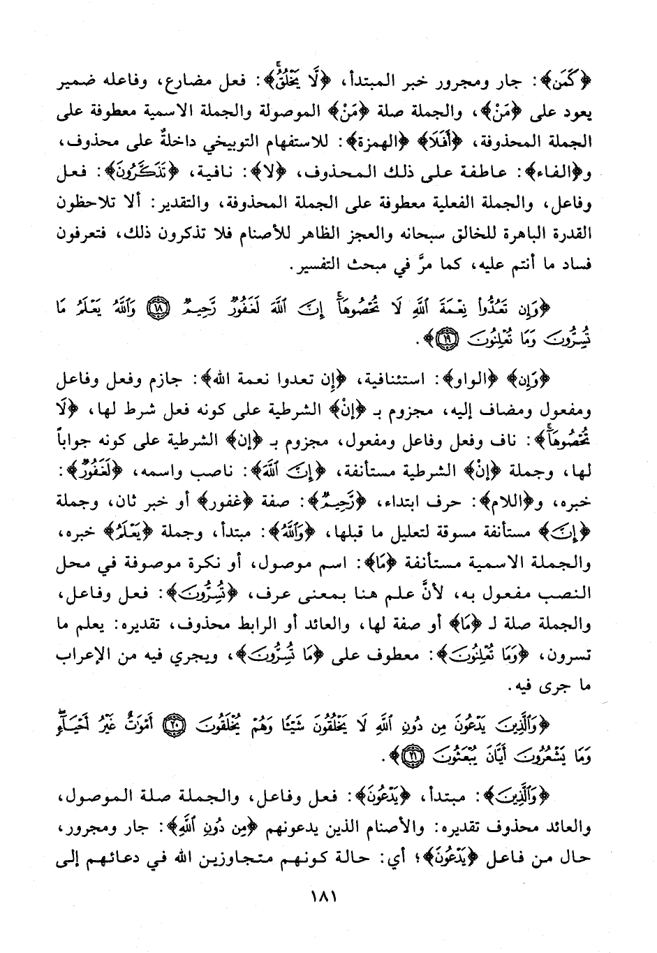 {كَمَن}: جار ومجرور خبر المبتدأ، {لَا يَخْلُقُ}: فعل مضارع، وفاعله ضمير يعود على {مَنْ}، والجملة صلة {مَنْ} الموصولة والجملة الاسمية معطوفة على الجملة المحذوفة، {أفَلَا} {الهمزة}: للاستفام التوبيخي داخلةٌ على محذوف، و {الفاء}: عاطفة على ذلك المحذوف، {لا}: نافية، {تَذَكَّرُونَ}: فعل وفاعل، والجملة الفعلية معطوفة على الجملة المحذوفة، والتقدير: ألا تلاحظون القدرة الباهرة للخالق سبحانه والعجز الظاهر للأصنام فلا تذكرون ذلك، فتعرفون فساد ما أنتم عليه، كما مرَّ في مبحث التفسير.