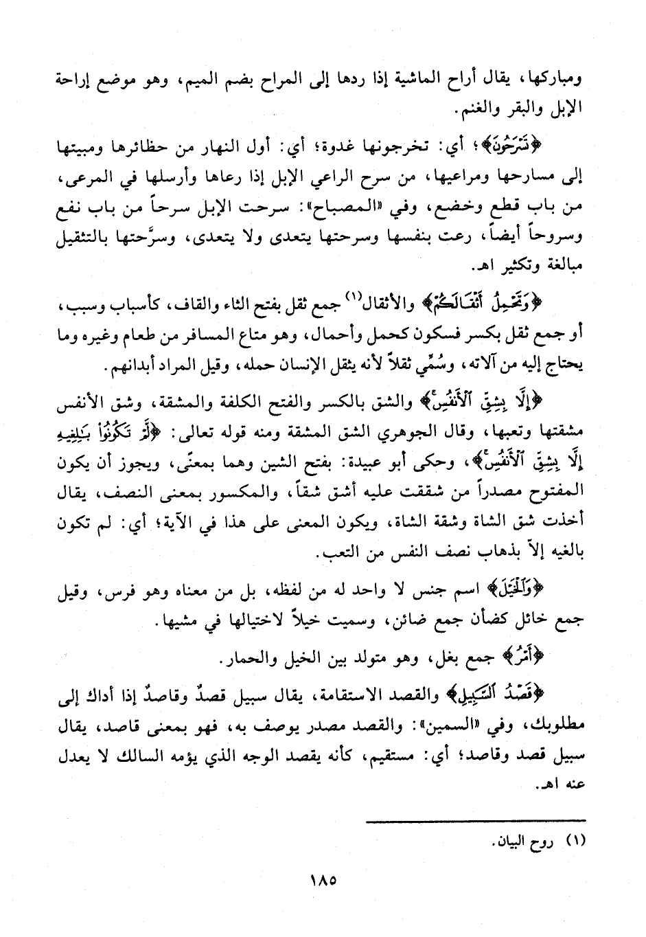 {تَسْرَحُونَ}؛ أي: تخرجونها غدوة؛ أي: أول النهار من حظائرها ومبيتها إلى مسارحها ومراعيها، من سرح الراعي الإبل إذا رعاها وأرسلها في المرعى، من باب قطع وخضع، وفي "المصباح": سرحت الإبل سرحًا من باب نفع وسروحًا أيضًا، رعت بنفسها وسرحتها يتعدى ولا يتعدى، وسرَّحتها بالتثقيل مبالغة وتكثير اهـ.
