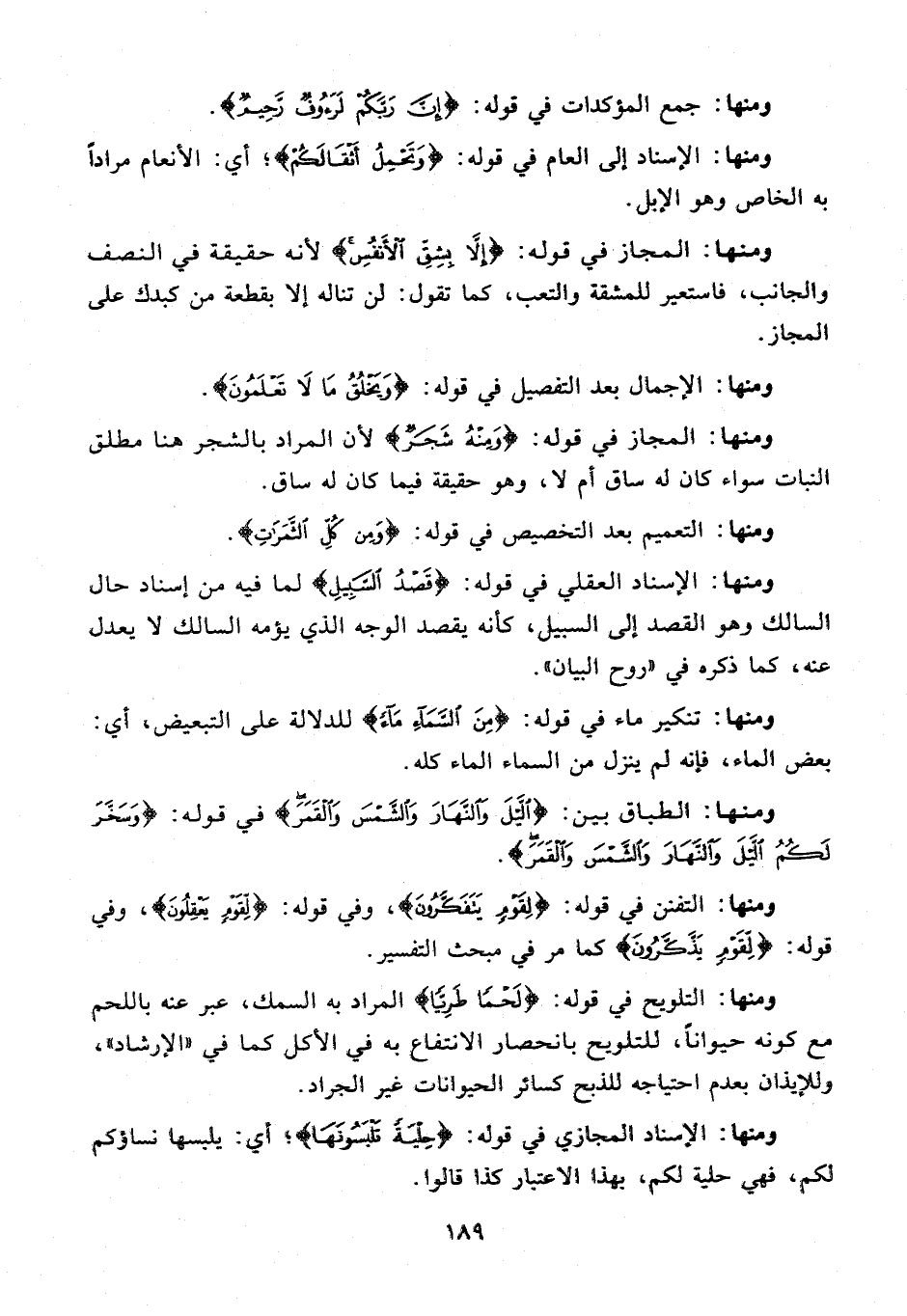 ومنها: الإسناد العقلي في قوله: {قَصْدُ السَّبِيلِ} لما فيه من إسناد حال السالك وهو القصد إلى السبيل، كأنه يقصد الوجه الذي يؤمه السالك لا يعدل عنه، كما ذكره في "روح البيان".