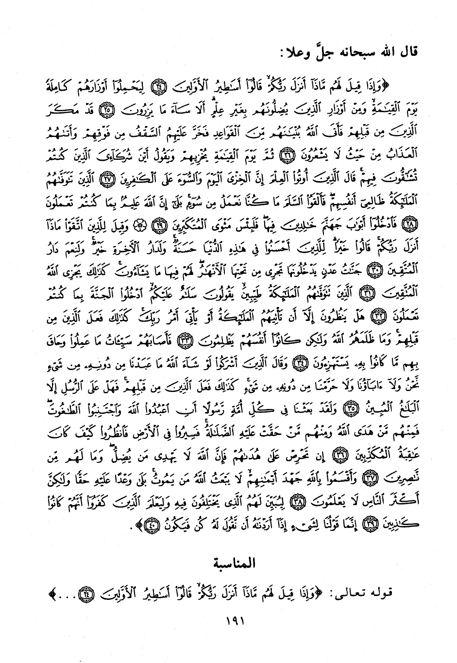 {وَإِذَا قِيلَ لَهُمْ مَاذَا أَنْزَلَ رَبُّكُمْ قَالُوا أَسَاطِيرُ الْأَوَّلِينَ (24) لِيَحْمِلُوا أَوْزَارَهُمْ كَامِلَةً يَوْمَ الْقِيَامَةِ وَمِنْ أَوْزَارِ الَّذِينَ يُضِلُّونَهُمْ بِغَيْرِ عِلْمٍ أَلَا سَاءَ مَا يَزِرُونَ (25) قَدْ مَكَرَ الَّذِينَ مِنْ قَبْلِهِمْ فَأَتَى اللَّهُ بُنْيَانَهُمْ مِنَ الْقَوَاعِدِ فَخَرَّ عَلَيْهِمُ السَّقْفُ مِنْ فَوْقِهِمْ وَأَتَاهُمُ الْعَذَابُ مِنْ حَيْثُ لَا يَشْعُرُونَ (26) ثُمَّ يَوْمَ الْقِيَامَةِ يُخْزِيهِمْ وَيَقُولُ أَيْنَ شُرَكَائِيَ الَّذِينَ كُنْتُمْ تُشَاقُّونَ فِيهِمْ قَالَ الَّذِينَ أُوتُوا الْعِلْمَ إِنَّ الْخِزْيَ الْيَوْمَ وَالسُّوءَ عَلَى الْكَافِرِينَ (27) الَّذِينَ تَتَوَفَّاهُمُ الْمَلَائِكَةُ ظَالِمِي أَنْفُسِهِمْ فَأَلْقَوُا السَّلَمَ مَا كُنَّا نَعْمَلُ مِنْ سُوءٍ بَلَى إِنَّ اللَّهَ عَلِيمٌ بِمَا كُنْتُمْ تَعْمَلُونَ (28) فَادْخُلُوا أَبْوَابَ جَهَنَّمَ خَالِدِينَ فِيهَا فَلَبِئْسَ مَثْوَى الْمُتَكَبِّرِينَ (29) وَقِيلَ لِلَّذِينَ اتَّقَوْا مَاذَا أَنْزَلَ رَبُّكُمْ قَالُوا خَيْرًا لِلَّذِينَ أَحْسَنُوا فِي هَذِهِ الدُّنْيَا حَسَنَةٌ وَلَدَارُ الْآخِرَةِ خَيْرٌ وَلَنِعْمَ دَارُ الْمُتَّقِينَ (30) جَنَّاتُ عَدْنٍ يَدْخُلُونَهَا تَجْرِي مِنْ تَحْتِهَا الْأَنْهَارُ لَهُمْ فِيهَا مَا يَشَاءُونَ كَذَلِكَ يَجْزِي اللَّهُ الْمُتَّقِينَ (31) الَّذِينَ تَتَوَفَّاهُمُ الْمَلَائِكَةُ طَيِّبِينَ يَقُولُونَ سَلَامٌ عَلَيْكُمُ ادْخُلُوا الْجَنَّةَ بِمَا كُنْتُمْ تَعْمَلُونَ (32) هَلْ يَنْظُرُونَ إِلَّا أَنْ تَأْتِيَهُمُ الْمَلَائِكَةُ أَوْ يَأْتِيَ أَمْرُ رَبِّكَ كَذَلِكَ فَعَلَ الَّذِينَ مِنْ قَبْلِهِمْ وَمَا ظَلَمَهُمُ اللَّهُ وَلَكِنْ كَانُوا أَنْفُسَهُمْ يَظْلِمُونَ (33) فَأَصَابَهُمْ سَيِّئَاتُ مَا عَمِلُوا وَحَاقَ بِهِمْ مَا كَانُوا بِهِ يَسْتَهْزِئُونَ (34) وَقَالَ الَّذِينَ أَشْرَكُوا لَوْ شَاءَ اللَّهُ مَا عَبَدْنَا مِنْ دُونِهِ مِنْ شَيْءٍ نَحْنُ وَلَا آبَاؤُنَا وَلَا حَرَّمْنَا مِنْ دُونِهِ مِنْ شَيْءٍ كَذَلِكَ فَعَلَ الَّذِينَ مِنْ قَبْلِهِمْ فَهَلْ عَلَى الرُّسُلِ إِلَّا الْبَلَاغُ الْمُبِينُ (35) وَلَقَدْ بَعَثْنَا فِي كُلِّ أُمَّةٍ رَسُولًا أَنِ اعْبُدُوا اللَّهَ وَاجْتَنِبُوا الطَّاغُوتَ فَمِنْهُمْ مَنْ هَدَى اللَّهُ وَمِنْهُمْ مَنْ حَقَّتْ عَلَيْهِ الضَّلَالَةُ فَسِيرُوا فِي الْأَرْضِ فَانْظُرُوا كَيْفَ كَانَ عَاقِبَةُ الْمُكَذِّبِينَ (36) إِنْ تَحْرِصْ عَلَى هُدَاهُمْ فَإِنَّ اللَّهَ لَا يَهْدِي مَنْ يُضِلُّ وَمَا لَهُمْ مِنْ نَاصِرِينَ (37) وَأَقْسَمُوا بِاللَّهِ جَهْدَ أَيْمَانِهِمْ لَا يَبْعَثُ اللَّهُ مَنْ يَمُوتُ بَلَى وَعْدًا عَلَيْهِ حَقًّا وَلَكِنَّ أَكْثَرَ النَّاسِ لَا يَعْلَمُونَ (38) لِيُبَيِّنَ لَهُمُ الَّذِي يَخْتَلِفُونَ فِيهِ وَلِيَعْلَمَ الَّذِينَ كَفَرُوا أَنَّهُمْ كَانُوا كَاذِبِينَ (39) إِنَّمَا قَوْلُنَا لِشَيْءٍ إِذَا أَرَدْنَاهُ أَنْ نَقُولَ لَهُ كُنْ فَيَكُونُ (40)}.