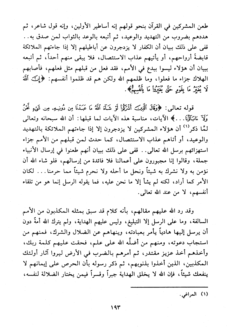 طعن المشركين في القرآن بنحو قولهم إنه أساطير الأولين، وإنه قول شاعر، ثم هددهم بضروب من التهديد والوعيد، ثم أتبعه بالوعد بالثواب لمن صدق به .. قفى على ذلك ببيان أن الكفار لا يزدجرون عن أباطيلهم إلا إذا جاءتهم الملائكة قابضة أرواحهم، أو يأتيهم عذاب الاستئصال، فلا يبقى منهم أحدًا، ثم أتبعه ببيان أن هؤلاء ليسوا ببدع في الأمم، فقد فعل من قبلهم مثل فعلهم، فأصابهم الهلاك جزاء ما فعلوا، وما ظلمهم الله ولكن هم قد ظلموا أنفسهم: {إِنَّ اللَّهَ لَا يُغَيِّرُ مَا بِقَوْمٍ حَتَّى يُغَيِّرُوا مَا بِأَنْفُسِهِمْ}.