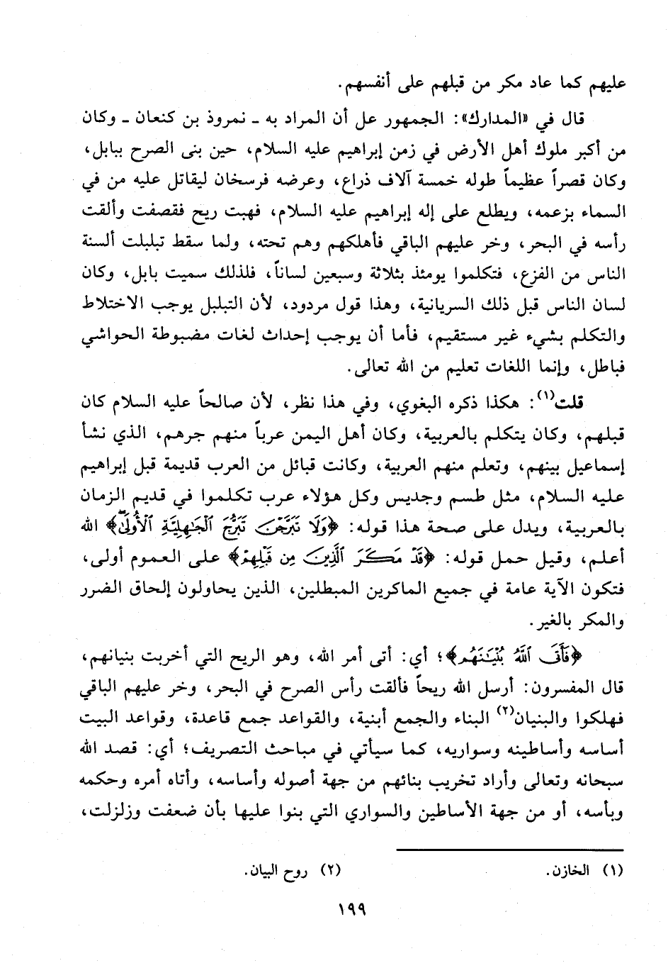 قال في "المدارك": الجمهور عل أن المراد به - نمروذ بن كنعان - وكان من أكبر ملوك أهل الأرض في زمن إبراهيم عليه السلام، حين بنى الصرح ببابل، وكان قصرًا عظيمًا طوله خمسة آلاف ذراع، وعرضه فرسخان ليقاتل عليه من في السماء بزعمه، ويطلع على إله إبراهيم عليه السلام، فهبت ريح فقصفت وألقت رأسه في البحر، وخر عليهم الباقي فأهلكهم وهم تحته، ولما سقط تبلبلت ألسنة الناس من الفزع، فتكلموا يومئذ بثلاثة وسبعين لسانًا، فلذلك سميت بابل، وكان لسان الناس قبل ذلك السريانية، وهذا قول مردود؛ لأن التبلبل يوجب الاختلاط والتكلم بشيء غير مستقيم، فأما أن يوجب إحداث لغات مضبوطة الحواشي فباطل، وإنما اللغات تعليم من الله تعالى.