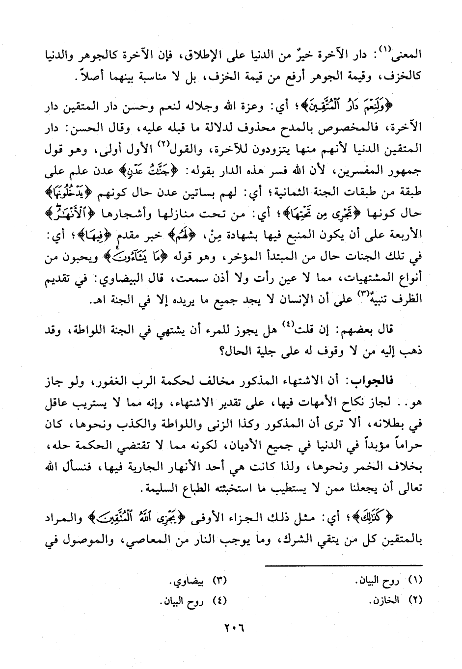 31 - لأن الله فسر هذه الدار بقوله: {جَنَّاتُ عَدْنٍ} عدن علم على طبقة من طبقات الجنة الثمانية؛ أي: لهم بساتين عدن حال كونهم {يَدْخُلُونَهَا} حال كونها {تَجْرِي مِنْ تَحْتِهَا}؛ أي: من تحت منازلها وأشجارها {الْأَنْهَارُ} الأربعة على أن يكون المنبع فيها بشهادة مِنْ، {لَهُمْ} خبر مقدم {فِيهَا}؛ أي: في تلك الجنات حال من المبتدأ المؤخر، وهو قوله {مَا يَشَاءُونَ} ويحبون من أنواع المشتهيات، مما لا عين رأت ولا أذن سمعت، قال البيضاوي: في تقديم الظرف تنبيهٌ (¬3) على أن الإنسان لا يجد جميع ما يريده إلا في الجنة اهـ.