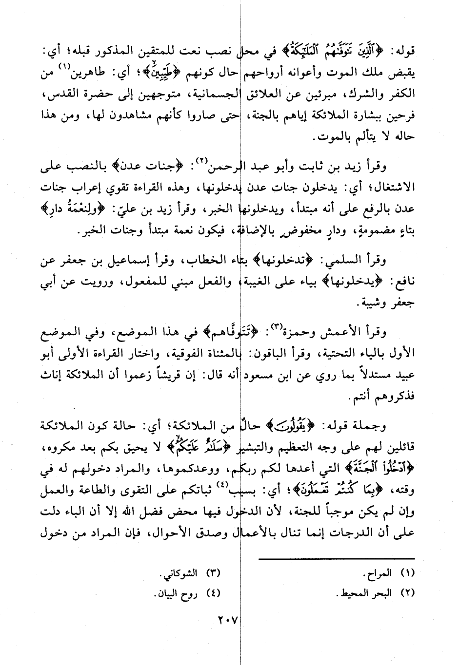 32 - قوله: {الَّذِينَ تَتَوَفَّاهُمُ الْمَلَائِكَةُ} في محل نصب نعت للمتقين المذكور قبله؛ أي: يقبض ملك الموت وأعوانه أرواحهم حال كونهم {طَيِّبِينَ}؛ أي: طاهرين (¬1) من الكفر والشرك، مبرئين عن العلائق الجسمانية، متوجهين إلى حضرة القدس، فرحين ببشارة الملائكة إياهم بالجنة، حتى صاروا كأنهم مشاهدون لها، ومن هذا حاله لا يتألم بالموت.