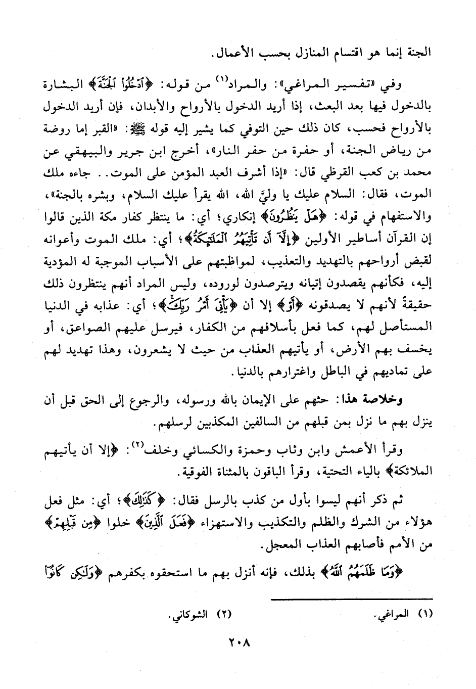 وفي "تفسير المراغي": والمراد (¬1) من قوله: {ادْخُلُوا الْجَنَّةَ} البشارة بالدخول فيها بعد البعث، إذا أريد الدخول بالأرواح والأبدان، فإن أريد الدخول بالأرواح فحسب، كان ذلك حين التوفي كما يشير إليه قوله - صلى الله عليه وسلم -: "القبر إما روضة من رياض الجنة، أو حفرة من حفر النار"، أخرج ابن جرير والبيهقي عن محمد بن كعب القرظي قال: "إذا أشرف العبد المؤمن على الموت .. جاءه ملك الموت، فقال: السلام عليك يا وليَّ الله، الله يقرأ عليك السلام، وبشره بالجنة"، 33 - 33 والاستفهام في قوله: {هَلْ يَنْظُرُونَ} إنكاري؛ أي: ما ينتظر كفار مكة الذين قالوا إن القرآن أساطير الأولين {إِلَّا أَنْ تَأْتِيَهُمُ الْمَلَائِكَةُ}، أى: ملك الموت وأعوانه لقبض رواحهم بالتهديد والتعذيب، لمواظبتهم على الأسباب الموجبة له المؤدية إليه، فكأنهم يقصدون إتيانه ويترصدون لوروده، وليس المراد أنهم ينتظرون ذلك حقيقةً لأنهم لا يصدقونه {أَوْ} إلا أن {يَأْتِيَ أَمْرُ رَبِّكَ}، أي: عذابه في الدنيا المستأصل لهم، كما فعل بأسلافهم من الكفار، فيرسل عليهم الصواعق، أو يخسف بهم الأرض، أو يأتيهم العذاب من حيث لا يشعرون، وهذا تهديد لهم على تماديهم في الباطل واغترارهم بالدنيا.