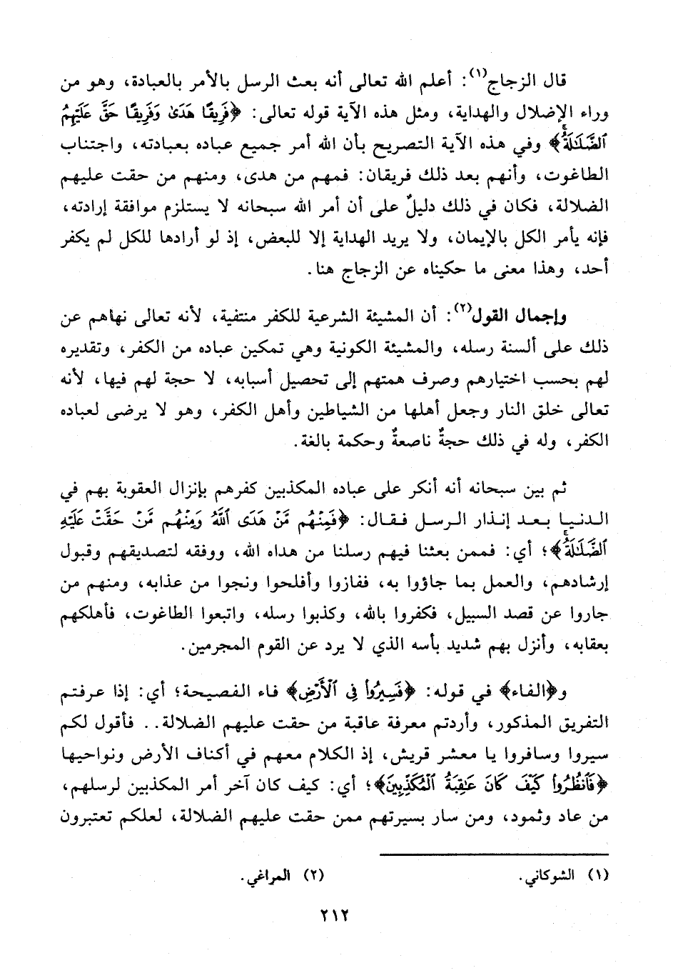 قال الزجاج (¬1): أعلم الله تعالى أنه بعث الرسل بالأمر بالعبادة، وهو من وراء الإضلال والهداية، ومثل هذه الآية قوله تعالى: {فَرِيقًا هَدَى وَفَرِيقًا حَقَّ عَلَيْهِمُ الضَّلَالَةُ} وفي هذه الآية التصريح بأن الله أمر جميع عباده بعبادته، واجتناب الطاغوت، وأنهم بيع ذلك فريقان: فمنهم من هدى، ومنهم من حقت عليهم الضلالة، فكان في ذلك دليلٌ على أن أمر الله سبحانه لا يستلزم موافقة إرادته، فإنه يأمر الكل بالإيمان، ولا يريد الهداية إلا للبعض، إذ لو أرادها للكل لم يكفر أحد، وهذا معنى ما حكيناه عن الزجاج هنا.
