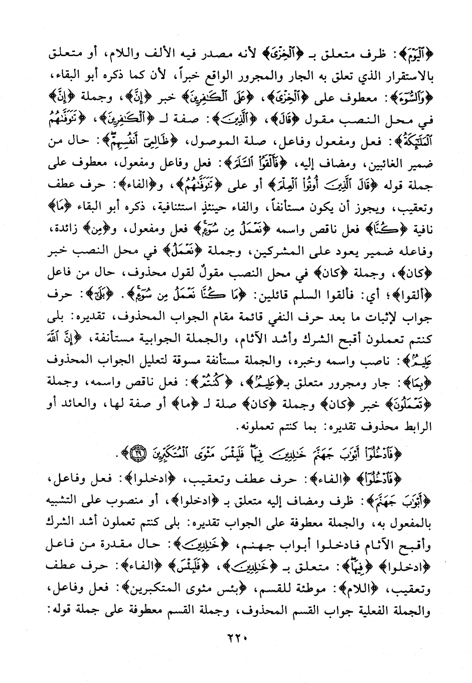 {فَادْخُلُوا} {الفاء}: حرف عطف وتعقيب، {ادخلوا}: فعل وفاعل، {أَبْوَابَ جَهَنَّمَ}: ظرف ومضاف إليه متعلق بـ {ادخلوا}، أو منصوب على التشبيه بالمفعول به، والجملة معطوفة على الجواب تقديره: بلى كنتم تعملون أشد الشرك وأقبح الآثام فادخلوا أبواب جهنم، {خَالِدِينَ}: حال مقدرة من فاعل {ادخلوا} {فِيهَا}: متعلق بـ {خَالِدِينَ}، {فَلَبِئْسَ} الفاء}: حرف عطف وتعقيب، {اللام}؛ موطئة للقسم، {بئس مثوى المتكبرين}: فعل وفاعل، والجملة الفعلية جواب القسم المحذوف، وجملة القسم معطوفة على جملة قوله: