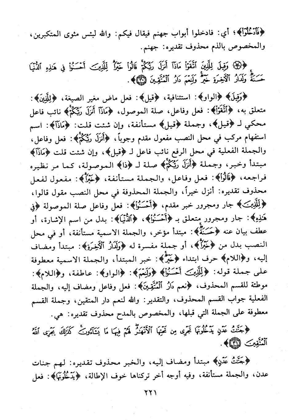 {وَقِيلَ} {الواو}: استئنافية، {قيل}: فعل ماض مغير الصيغة، {لِلَّذِينَ}: متعلق به، {اتَّقَوْا}: فعل وفاعل، صلة الموصول، {مَاذَا أَنْزَلَ رَبُّكُمْ} نائب فاعل محكي لـ {قيل}، وجملة {قيل} مستأنفة، وإن شئت قلت: {مَاذَا}: اسم استفهام مركب في محل النصب مفعول مقدم وجوبًا، {أَنْزَلَ رَبُّكُمْ}: فعل وفاعل، والجملة الفعلية في محل الرفع نائب فاعل لـ {قيل}، وإن شئت قلت {مَاذَا} مبتدأ وخبر، وجملة {أَنْزَلَ رَبُّكُمْ} صلة لـ {ذا} الموصولة، كما مر نظيره فراجعه، {قَالُوا}: فعل وفاعل، الجملة مستأنفة، {خَيْرًا}: مفعول لفعل محذوف تقديره: أنزل خيرًا، والجملة المحذوفة في محل النصب مقول قالوا، {لِلَّذِينَ} جار ومجرور خبر مقدم، {أَحْسَنُوا}: فعل وفاعل صلة الموصولة {فِي هَذِهِ}: جار ومجرور متعلق بـ {أَحْسَنُوا}، {الدُّنْيَا}: بدل من اسم الإشارة، أو عطف بيان عنه {حَسَنَةٌ}: مبتدأ مؤخر، والجملة الاسمية مستأنفة، أو في محل النصب بدل من {خَيْرًا}، أو جملة مفسرة له {وَلَدَارُ الْآخِرَةِ}: مبتدأ ومضاف إليه، و {اللام} حرف ابتداء {خَيْرٌ}: خبر المبتدأ، والجملة الاسمية معطوفة على جملة قوله: {لِلَّذِينَ أَحْسَنُوا} {وَلَنِعْمَ}: {الواو}: عاطفة، و {اللام}: موطئة للقسم المحذوف، {نِعْمَ دَارُ الْمُتَّقِينَ}: فعل وفاعل ومضاف إليه، والجملة الفعلية جواب القسم المحذوف، والتقدير: والله لنعم دار المتقين، وجملة القسم معطوفة على الجملة التي قبلها، والمخصوص بالمدح محذوف تقديره: هي.