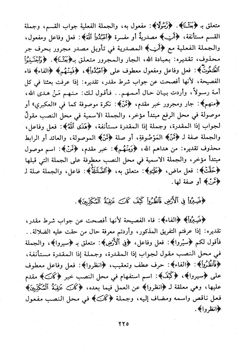 {فَسِيرُوا} {الفاء}: فاء الفصيحة لأنها أفصحت عن جواب شرط مقدر، تقديره: إذا عرفتم التفريق المذكور، وأردتم معرفة حال من حقت عليه الضلالة .. فأقول لكم {سيْروا}: فعل وفاعل، {فِي الْأَرْضِ}: متعلق بـ {سيروا}، والجملة في محل النصب مقول لجواب إذا المقدرة، وجملة إذا المقدرة مستأنفة، {فَانْظُرُوا}: {الفاء}: حرف عطف وتعقيب، {انظروا}: فعل وفاعل معطوف على {سيروا}، {كَيْفَ}: اسم استفهام في محل النصب خبر {كَانَ} مقدم عليها، وهي معلقة لـ {انظروا} عن العمل فيما بعده، {كَيْفَ كَانَ عَاقِبَةُ الْمُكَذِّبِينَ} فعل ناقص واسمه ومضاف إليه، وجملة {كَانَ} في محل النصب مفعول {انظروا}.