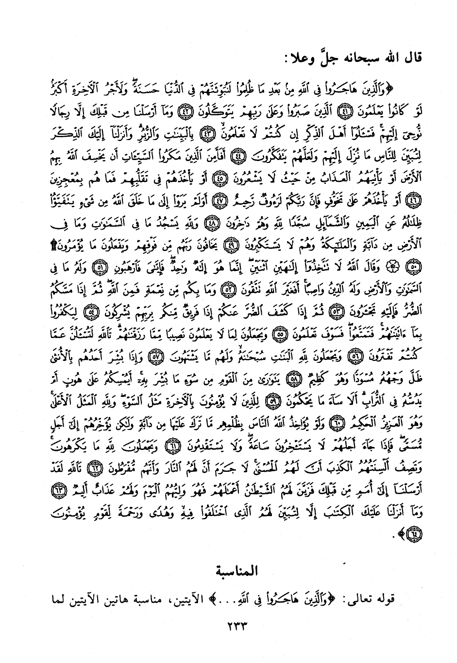 {وَالَّذِينَ هَاجَرُوا فِي اللَّهِ مِنْ بَعْدِ مَا ظُلِمُوا لَنُبَوِّئَنَّهُمْ فِي الدُّنْيَا حَسَنَةً وَلَأَجْرُ الْآخِرَةِ أَكْبَرُ لَوْ كَانُوا يَعْلَمُونَ (41) الَّذِينَ صَبَرُوا وَعَلَى رَبِّهِمْ يَتَوَكَّلُونَ (42) وَمَا أَرْسَلْنَا مِنْ قَبْلِكَ إِلَّا رِجَالًا نُوحِي إِلَيْهِمْ فَاسْأَلُوا أَهْلَ الذِّكْرِ إِنْ كُنْتُمْ لَا تَعْلَمُونَ (43) بِالْبَيِّنَاتِ وَالزُّبُرِ وَأَنْزَلْنَا إِلَيْكَ الذِّكْرَ لِتُبَيِّنَ لِلنَّاسِ مَا نُزِّلَ إِلَيْهِمْ وَلَعَلَّهُمْ يَتَفَكَّرُونَ (44) أَفَأَمِنَ الَّذِينَ مَكَرُوا السَّيِّئَاتِ أَنْ يَخْسِفَ اللَّهُ بِهِمُ الْأَرْضَ أَوْ يَأْتِيَهُمُ الْعَذَابُ مِنْ حَيْثُ لَا يَشْعُرُونَ (45) أَوْ يَأْخُذَهُمْ فِي تَقَلُّبِهِمْ فَمَا هُمْ بِمُعْجِزِينَ (46) أَوْ يَأْخُذَهُمْ عَلَى تَخَوُّفٍ فَإِنَّ رَبَّكُمْ لَرَءُوفٌ رَحِيمٌ (47) أَوَلَمْ يَرَوْا إِلَى مَا خَلَقَ اللَّهُ مِنْ شَيْءٍ يَتَفَيَّأُ ظِلَالُهُ عَنِ الْيَمِينِ وَالشَّمَائِلِ سُجَّدًا لِلَّهِ وَهُمْ دَاخِرُونَ (48) وَلِلَّهِ يَسْجُدُ مَا فِي السَّمَاوَاتِ وَمَا فِي الْأَرْضِ مِنْ دَابَّةٍ وَالْمَلَائِكَةُ وَهُمْ لَا يَسْتَكْبِرُونَ (49) يَخَافُونَ رَبَّهُمْ مِنْ فَوْقِهِمْ وَيَفْعَلُونَ مَا يُؤْمَرُونَ (50) وَقَالَ اللَّهُ لَا تَتَّخِذُوا إِلَهَيْنِ اثْنَيْنِ إِنَّمَا هُوَ إِلَهٌ وَاحِدٌ فَإِيَّايَ فَارْهَبُونِ (51) وَلَهُ مَا فِي السَّمَاوَاتِ وَالْأَرْضِ وَلَهُ الدِّينُ وَاصِبًا أَفَغَيْرَ اللَّهِ تَتَّقُونَ (52) وَمَا بِكُمْ مِنْ نِعْمَةٍ فَمِنَ اللَّهِ ثُمَّ إِذَا مَسَّكُمُ الضُّرُّ فَإِلَيْهِ تَجْأَرُونَ (53) ثُمَّ إِذَا كَشَفَ الضُّرَّ عَنْكُمْ إِذَا فَرِيقٌ مِنْكُمْ بِرَبِّهِمْ يُشْرِكُونَ (54) لِيَكْفُرُوا بِمَا آتَيْنَاهُمْ فَتَمَتَّعُوا فَسَوْفَ تَعْلَمُونَ (55) وَيَجْعَلُونَ لِمَا لَا يَعْلَمُونَ نَصِيبًا مِمَّا رَزَقْنَاهُمْ تَاللَّهِ لَتُسْأَلُنَّ عَمَّا كُنْتُمْ تَفْتَرُونَ (56) وَيَجْعَلُونَ لِلَّهِ الْبَنَاتِ سُبْحَانَهُ وَلَهُمْ مَا يَشْتَهُونَ (57) وَإِذَا بُشِّرَ أَحَدُهُمْ بِالْأُنْثَى ظَلَّ وَجْهُهُ مُسْوَدًّا وَهُوَ كَظِيمٌ (58) يَتَوَارَى مِنَ الْقَوْمِ مِنْ سُوءِ مَا بُشِّرَ بِهِ أَيُمْسِكُهُ عَلَى هُونٍ أَمْ يَدُسُّهُ فِي التُّرَابِ أَلَا سَاءَ مَا يَحْكُمُونَ (59) لِلَّذِينَ لَا يُؤْمِنُونَ بِالْآخِرَةِ مَثَلُ السَّوْءِ وَلِلَّهِ الْمَثَلُ الْأَعْلَى وَهُوَ الْعَزِيزُ الْحَكِيمُ (60) وَلَوْ يُؤَاخِذُ اللَّهُ النَّاسَ بِظُلْمِهِمْ مَا تَرَكَ عَلَيْهَا مِنْ دَابَّةٍ وَلَكِنْ يُؤَخِّرُهُمْ إِلَى أَجَلٍ مُسَمًّى فَإِذَا جَاءَ أَجَلُهُمْ لَا يَسْتَأْخِرُونَ سَاعَةً وَلَا يَسْتَقْدِمُونَ (61) وَيَجْعَلُونَ لِلَّهِ مَا يَكْرَهُونَ وَتَصِفُ أَلْسِنَتُهُمُ الْكَذِبَ أَنَّ لَهُمُ الْحُسْنَى لَا جَرَمَ أَنَّ لَهُمُ النَّارَ وَأَنَّهُمْ مُفْرَطُونَ (62) تَاللَّهِ لَقَدْ أَرْسَلْنَا إِلَى أُمَمٍ مِنْ قَبْلِكَ فَزَيَّنَ لَهُمُ الشَّيْطَانُ أَعْمَالَهُمْ فَهُوَ وَلِيُّهُمُ الْيَوْمَ وَلَهُمْ عَذَابٌ أَلِيمٌ (63) وَمَا أَنْزَلْنَا عَلَيْكَ الْكِتَابَ إِلَّا لِتُبَيِّنَ لَهُمُ الَّذِي اخْتَلَفُوا فِيهِ وَهُدًى وَرَحْمَةً لِقَوْمٍ يُؤْمِنُونَ (64)}.