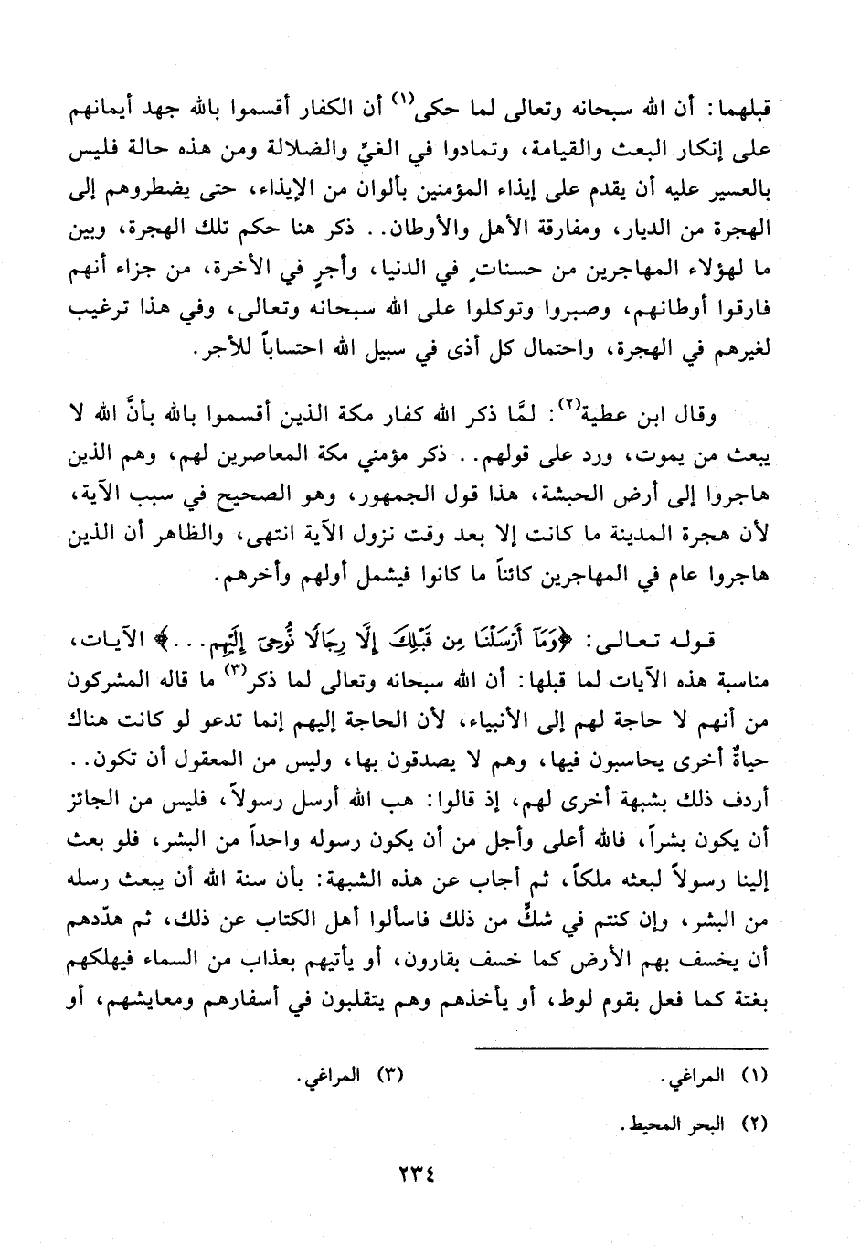 قوله تعالى: {وَمَا أَرْسَلْنَا مِنْ قَبْلِكَ إِلَّا رِجَالًا نُوحِي إِلَيْهِمْ ...} الآيات، مناسبة هذه الآيات لما قبلها: أن الله سبحانه وتعالى لما ذكر (¬3) ما قاله المشركون من أنهم لا حاجة لهم إلى الأنبياء؛ لأن الحاجة إليهم إنما تدعو لو كانت هناك حياةٌ أخرى يحاسبون فيها، وهم لا يصدقون بها، وليس من المعقول أن تكون .. أردف ذلك بشبهة أخرى لهم، إذ قالوا: هب الله أرسل رسولًا، فليس من الجائز أن يكون بشرًا، فالله أعلى وأجل من أن يكون رسوله واحدًا من البشر، فلو بعث إلينا رسولًا لبعثه ملكًا، ثم أجاب عن هذه الشبهة: بأن سنة الله أن يبعث رسله من البشر، وإن كنتم في شكٍّ من ذلك فاسألوا أهل الكتاب عن ذلك، ثم هدّدهم أن يخسف بهم الأرض كما خسف بقارون، أو يأتيهم بعذاب من السماء فيهلكهم بغتة كما فعل بقوم لوط، أو يأخذهم وهم يتقلبون في أسفارهم ومعايشهم، أو