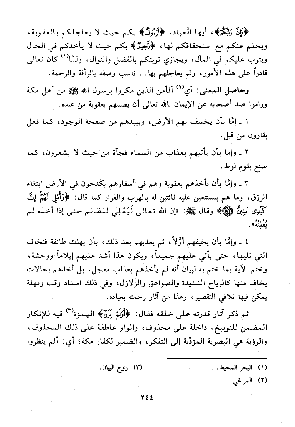 4 - وإمَّا بأن يخيفهم أوَّلًا، ثم يعذبهم بعد ذلك، بأن يهلك طائفة فتخاف التي تليها، حتى يأتي عليهم جميعًا، ويكون هذا أشد عليهم إيلامًا ووحشة، وختم الآية بما ختم به لبيان أنه لم يأخذهم بعذاب معجل، بل أخذهم بحالات يخاف منها كالرياح الشديدة والصواعق والزلازل، وفي ذلك امتداد وقت ومهلة يمكن فيها تلافي التقصير، وهذا من آثار رحمته بعباده.
