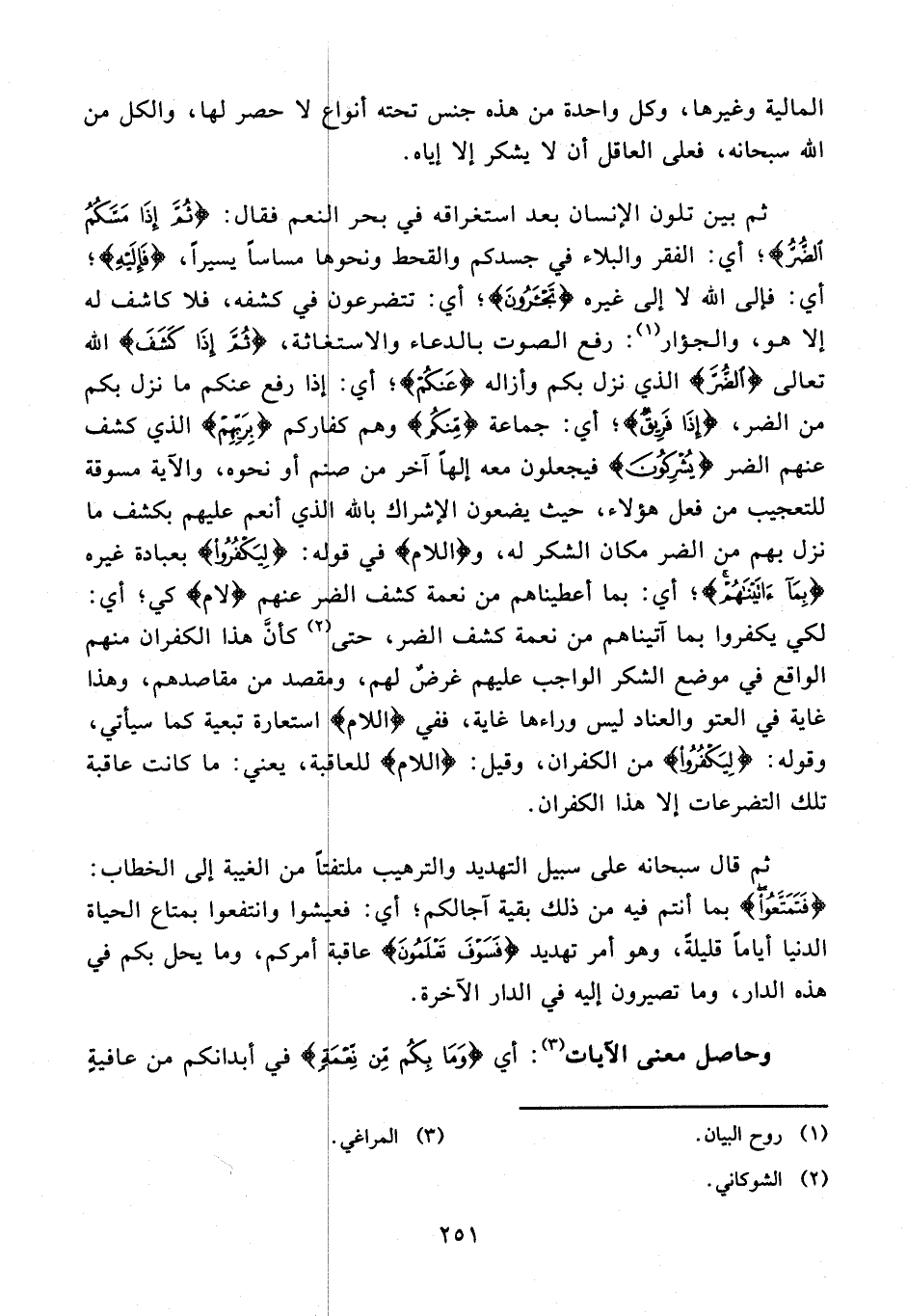 ثم بين تلون الإنسان بعد استغراقه في بحر النعم فقال: {ثُمَّ إِذَا مَسَّكُمُ الضُّرُّ}؛ أي: الفقر والبلاء في جسدكم والقحط ونحوها مساسًا يسيرًا، {فَإِلَيْهِ}؛ أي: فإلى الله لا إلى غيره {تَجْأَرُونَ}؛ أي: تتضرعون في كشفه، فلا كاشف له إلا هو، والجؤار (¬1): رفع الصوت بالدعاء والاستغاثة، {ثُمَّ إِذَا كَشَفَ} الله تعالى {الضُّرَّ} الذي نزل بكم وأزاله {عَنْكُمْ}؛ أي: إذا رفع عنكم ما نزل بكم من الضر، {إِذَا فَرِيقٌ}؛ أي: جماعة {مِنْكُمْ} وهم كفاركم {بِرَبِّهِمْ} الذي كشف عنهم الضر {يُشْرِكُونَ} فيجعلون معه إلهًا آخر من صنم أو نحوه، والآية مسوقة للتعجيب من فعل هؤلاء، حيث يضعون الإشراك باللهِ الذي أنعم عليهم بكشف ما نزل بهم من الضر مكان الشكر له، و {اللام} في قوله: {لِيَكْفُرُوا} بعبادة غيره {بِمَا آتَيْنَاهُمْ}؛ أي: بما أعطيناهم من نعمة كشف الضر عنهم {لام} كي؛ أي: لكي يكفروا بما آتيناهم من نعمة كشف الضر، حتى (¬2) كأنَّ هذا الكفران منهم الواقع في موضع الشكر الواجب عليهم غرضٌ لهم، ومقصد من مقاصدهم، وهذا غاية في العتو والعناد ليس وراءها غاية، ففي {اللام} استعارة تبعية كما سيأتي، وقوله: {لِيَكْفُرُوا} من الكفران، وقيل: {اللام} للعاقبة، يعني: ما كانت عاقبة تلك التضرعات إلا هذا الكفران.