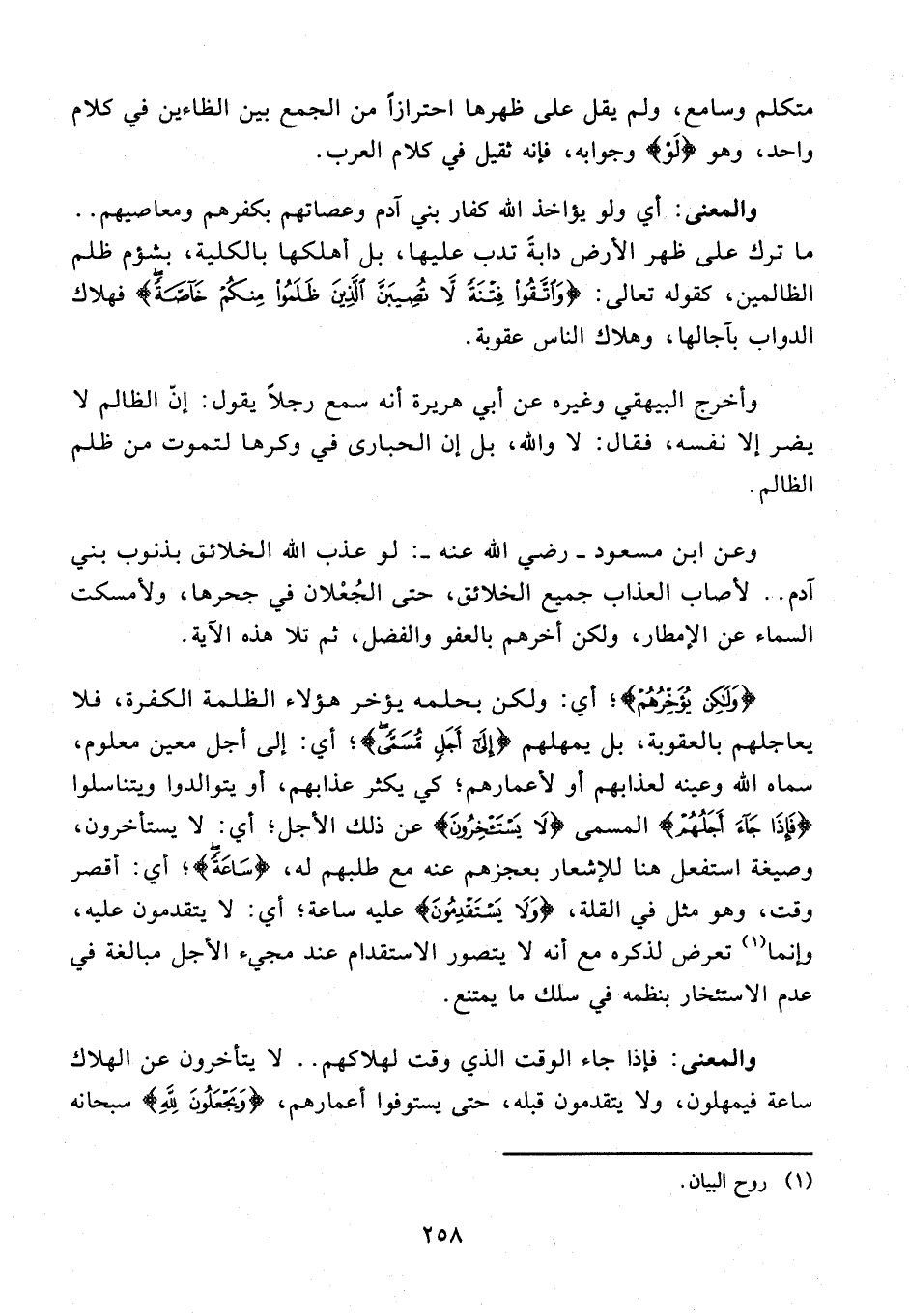 وعن ابن مسعود - رضي الله عنه -: لو عذب الله الخلائق بذنوب بني آدم .. لأصاب العذاب جميع الخلائق، حتى الجُعْلان في جحرها، ولأمسكت السماء عن الإمطار، ولكن أخرهم بالعفو والفضل، ثم تلا هذه الآية.