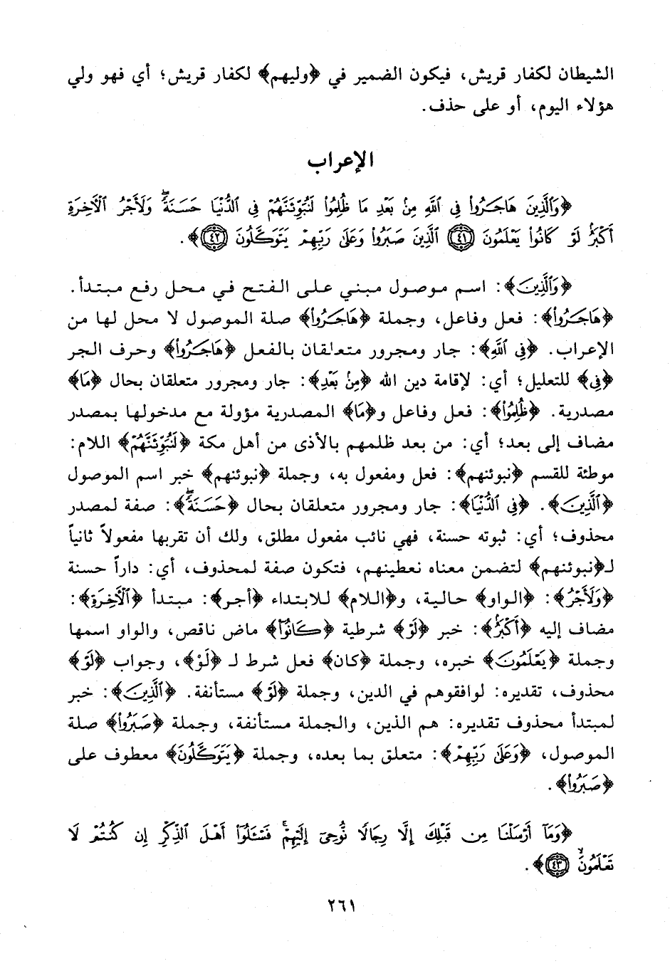 {وَالَّذِينَ}: اسم موصول مبني على الفتح في محل رفع مبتدأ. {هَاجَرُوا}: فعل وفاعل، وجملة {هَاجَرُوا} صلة الموصول لا محل لها من الإعراب. {فِي اللَّهِ}: جار ومجرور متعلقان بالفعل {هَاجَرُوا} وحرف الجر {فِي} للتعليل؛ أي: لإقامة دين الله {مِنْ بَعْدِ}: جار ومجرور متعلقان بحال {مَا} مصدرية. {ظُلِمُوا}: فعل وفاعل و {مَا} المصدرية مؤولة مع مدخولها بمصدر مضاف إلى بعد؛ أي: من بعد ظلمهم بالأذى من أهل مكة {لَنُبَوِّئَنَّهُمْ} اللام: موطئة للقسم {نبوئنهم}: فعل ومفعول به، وجملة {نبوئنهم} خبر اسم الموصول {وَالَّذِينَ}. {فِي الدُّنْيَا}: جار ومجرور متعلقان بحال {حَسَنَةً}: صفة لمصدر محذوف؛ أي: ثبوته حسنة، فهي نائب مفعول مطلق، ولك أن تقربها مفعولًا ثانيًا لـ {نبوئنهم} لتضمن معناه نعطينهم، فتكون صفة لمحذوف، أي: دارًا حسنة {وَلَأَجْرُ}: {الواو} حالية، و {اللام} للابتداء {أجر}: مبتدأ {الْآخِرَةِ}: مضاف إليه {أَكْبَرُ}: خبر {لَوْ} شرطية {كَانُوا} ماض ناقص، والواو اسمها وجملة {يَعْلَمُونَ} خبره، وجملة {كان} فعل شرط لـ {لَوْ}، وجواب {لَوْ} محذوف، تقديره: لوافقوهم في الدين، وجملة {لَوْ} مستأنفة. {الَّذِينَ}: خبر لمبتدأ محذوف تقديره: هم الذين، والجملة مستأنفة، وجملة {صَبَرُوا} صلة الموصول، {وَعَلَى رَبِّهِمْ}: متعلق بما بعده، وجملة {يَتَوَكَّلُونَ} معطوف على {صَبَرُوا}.