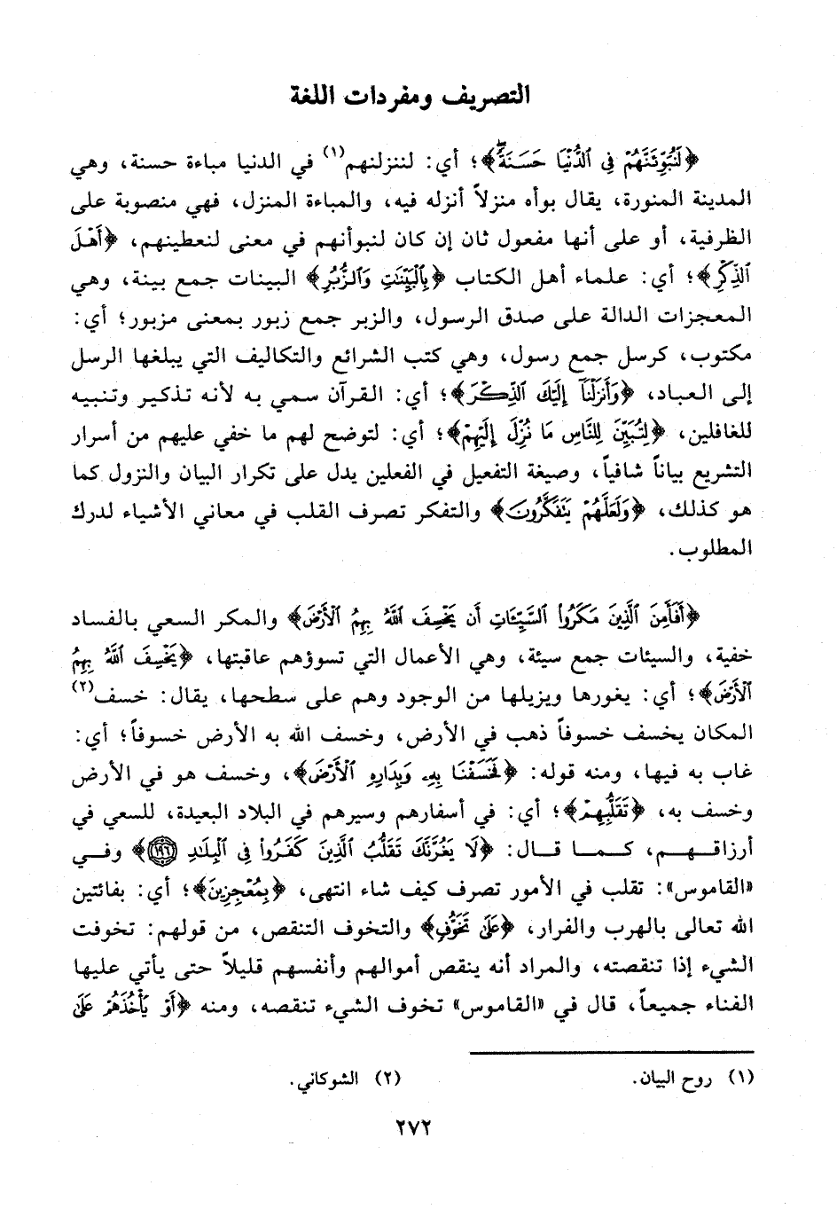 {أَفَأَمِنَ الَّذِينَ مَكَرُوا السَّيِّئَاتِ أَنْ يَخْسِفَ اللَّهُ بِهِمُ الْأَرْضَ} والمكر السعي بالفساد خفية، والسيئات جمع سيئة، وهي الأعمال التي تسوؤهم عاقبتها، {يَخْسِفَ اللَّهُ بِهِمُ الْأَرْضَ}؛ أي: يغورها ويزيلها من الوجود وهم على سطحها، يقال: خسف (¬2) المكان يخسف خسوفًا ذهب في الأرض، وخسف الله به الأرض خسوفًا؛ أي: غاب به فيها، ومنه قوله: {فَخَسَفْنَا بِهِ وَبِدَارِهِ الْأَرْضَ}، وخسف هو في الأرض وخسف به، {تَقَلُّبِهِمْ}؛ أي: في أسفارهم وسيرهم في البلاد البعيدة، للسعي في أرزاقهم، كما قال: {لَا يَغُرَّنَّكَ تَقَلُّبُ الَّذِينَ كَفَرُوا فِي الْبِلَادِ (196)} وفي "القاموس": تقلب في الأمور تصرف كيف شاء انتهى، {بِمُعْجِزِينَ}؛ أي: بفائتين الله تعالى بالهرب والفرار، {عَلَى تَخَوُّفٍ} والتخوف التنقص، من قولهم: تخوفت الشيء إذا تنقصته، والمراد أنه ينقص أموالهم وأنفسهم قليلًا حتى يأتي عليها الفناء جميعًا، قال في "القاموس" تخوف الشيء تنقصه، ومنه {أَوْ يَأْخُذَهُمْ عَلَى