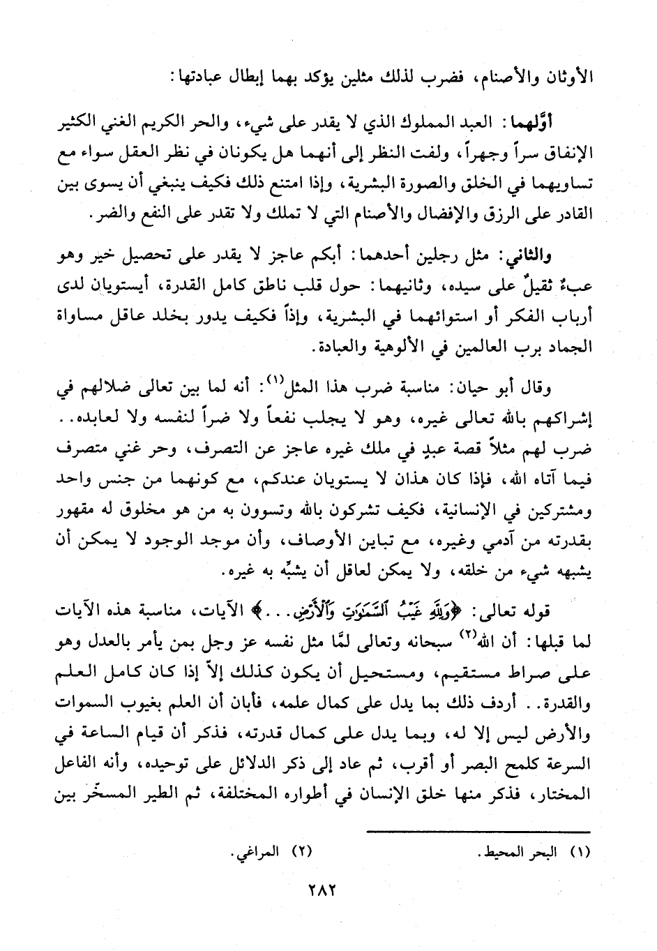 أوَّلهما: العبد المملوك الذي لا يقدر على شيء، والحر الكريم الغني الكثير الإنفاق سرًّا وجهرًا، ولفت النظر إلى أنهما هل يكونان في نظر العقل سواء مع تساويهما في الخلق والصورة البشرية، وإذا امتنع ذلك فكيف ينبغي أن يسوى بين القادر على الرزق والإفضال والأصنام التي لا تملك ولا تقدر على النفع والضر.