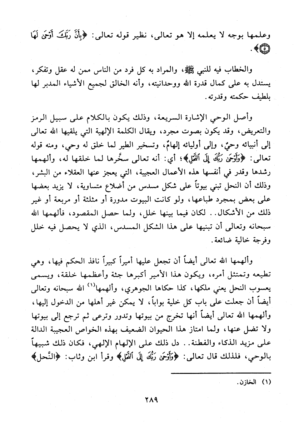 وأصل الوحي الإشارة السريعة، وذلك يكون بالكلام على سبيل الرمز والتعريض، وقد يكون بصوت مجرد، ويقال الكلمة الإلهية التي يلقيها الله تعالى إلى أنبيائه وحيٌ، وإلى أوليائه إلهامٌ، وتسخير الطير لما خلق له وحي، ومنه قوله تعالى: {وَأَوْحَى رَبُّكَ إِلَى النَّحْلِ}؛ أي: أنه تعالى سخَّرها لما خلقها له، وألهمها رشدها وقدر في أنفسها هذه الأعمال العجيبة، التي يعجز عنها العقلاء من البشر، وذلك أن النحل تبني بيوتًا على شكل مسدس من أضلاع متساوية، لا يزيد بعضها على بعض بمجرد طباعها، ولو كانت البيوت مدورة أو مثلثة أو مربعة أو غير ذلك من الأشكال .. لكان فيما بينها خلل، ولما حصل المقصود، فألهمها الله سبحانه وتعالى أن تبنيها على هذا الشكل المسدس، الذي لا يحصل فيه خلل وفرجة خالية ضائعة.