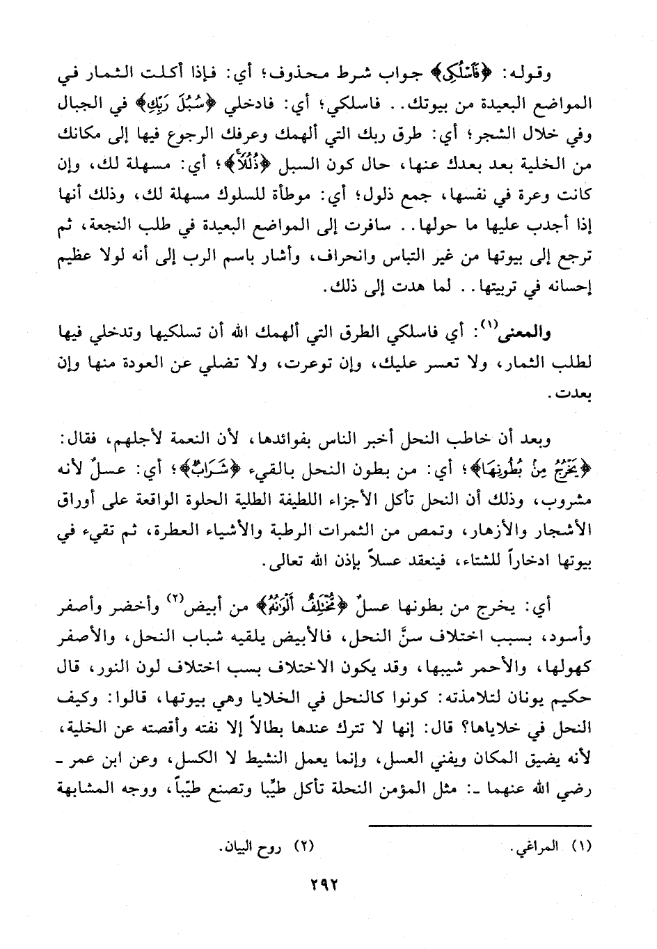 وقوله: {فَاسْلُكِي} جواب شرط محذوف؛ أي: فإذا أكلت الثمار في المواضع البعيدة من بيوتك .. فاسلكي؛ أي: فادخلي {سُبُلَ رَبِّكِ} في الجبال وفي خلال الشجر؛ أي: طرق ربك التي ألهمك وعرفك الرجوع فيها إلى مكانك من الخلية بعد بعدك عنها، حال كون السبل {ذُلُلًا}؛ أي: مسهلة لك، وإن كانت وعرة في نفسها، جمع ذلول؛ أي: موطأة للسلوك مسهلة لك، وذلك أنها إذا أجدب عليها ما حولها .. سافرت إلى المواضع البعيدة في طلب النجعة، ثم ترجع إلى بيوتها من غير التباس وانحراف، وأشار باسم الرب إلى أنه لولا عظيم إحسانه في تربيتها .. لما هدت إلى ذلك.