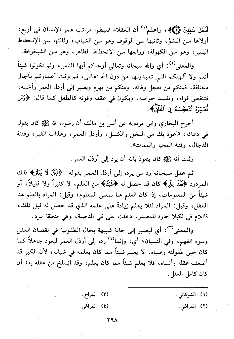 أَسْفَلَ سَافِلِينَ (5)}، واعلم (¬1) أن العقلاء ضبطوا مراتب عمر الإنسان في أربع: أولاها سن النشوِّ، وثانيها سن الوقوف وهو سن الشباب، وثالثها سن الإنحطاط اليسير، وهو سن الكهولة، ورابعها سن الانحطاط الظاهر، وهو سن الشيخوخة.