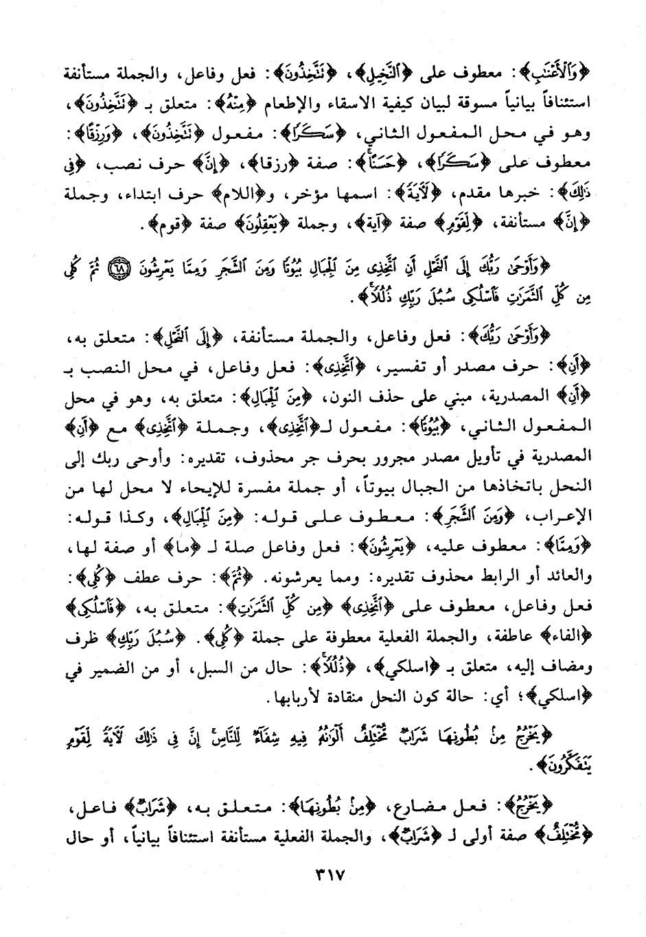 {وَأَوْحَى رَبُّكَ}: فعل وفاعل، والجملة مستأنفة، {إِلَى النَّحْلِ}: متعلق به، {أَنِ}: حرف مصدر أو تفسير، {اتَّخِذِي}: فعل وفاعل، في محل النصب بـ {أَنِ} المصدرية، مبني على حذف النون، {مِنَ الْجِبَالِ}: متعلق به، وهو في محل المفعول الثاني، {بُيُوتًا}: مفعول لـ {اتَّخِذِي}، وجملة {اتَّخِذِي} مع {أَنِ} المصدرية في تأويل مصدر مجرور بحرف جر محذوف، تقديره: وأوحى ربك إلى النحل باتخاذها من الجبال بيوتًا، أو جملة مفسرة للإيحاء لا محل لها من الإعراب، {وَمِنَ الشَّجَرِ}: معطوف على قوله: {مِنَ الْجِبَالِ}، وكذا قوله: {وَمِمَّا}: معطوف عليه، {يَعْرِشُونَ}: فعل وفاعل صلة لـ {ما} أو صفة لها، والعائد أو الرابط محذوف تقديره: ومما يعرشونه. {ثُمَّ}: حرف عطف {كُلِي}: فعل وفاعل، معطوف على {اتَّخِذِي {مِنْ كُلِّ الثَّمَرَاتِ}: متعلق به، {فَاسْلُكِي} {الفاء} عاطفة، والجملة الفعلية معطوفة على جملة {كُلِي}. {سُبُلَ رَبِّكِ} ظرف ومضاف إليه، متعلق بـ {اسلكي}، {ذُلُلًا}: حال من السبل، أو من الضمير في {اسْلُكِي}؛ أي: حالة كون النحل منقادة لأربابها.