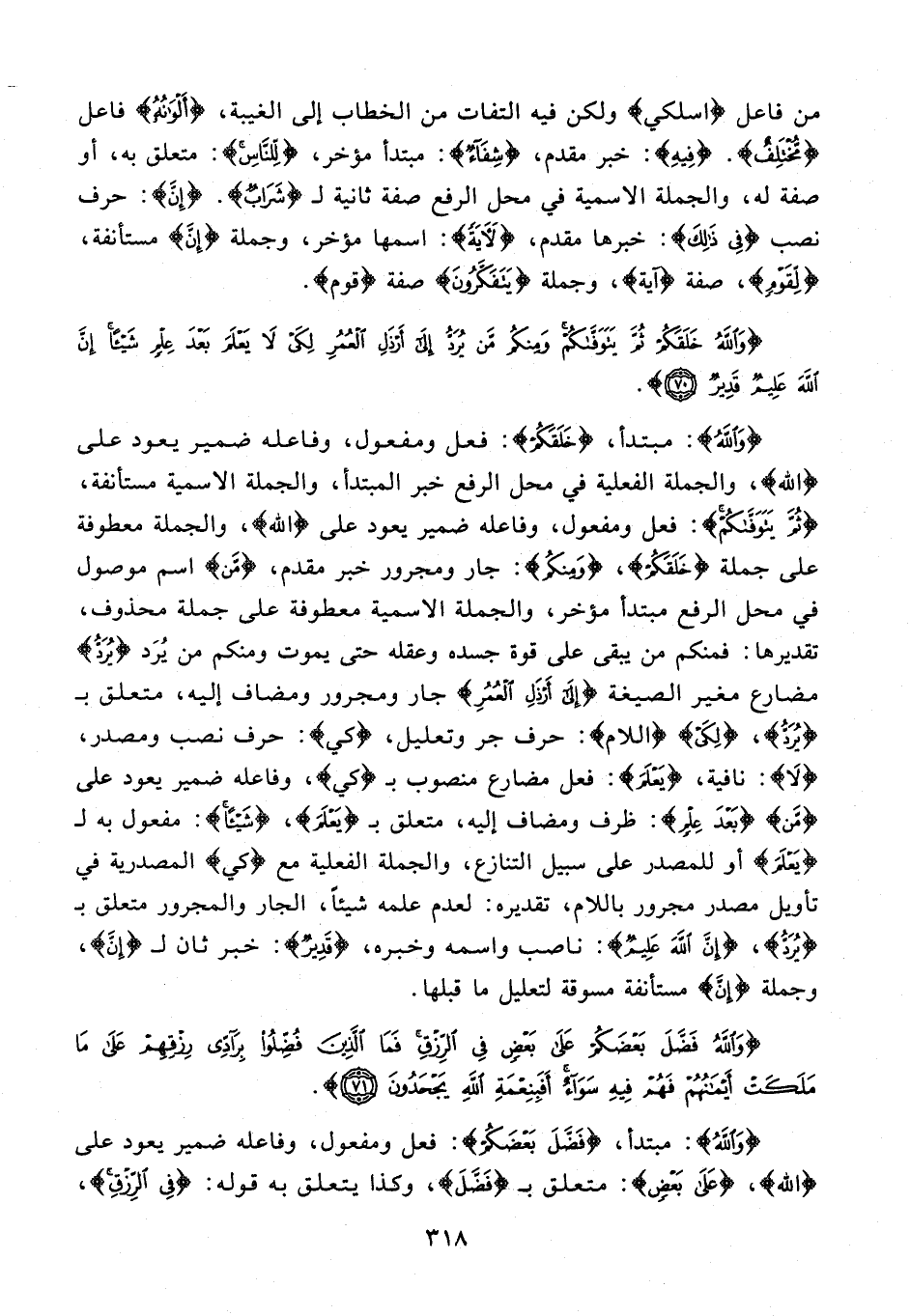 {وَاللَّهُ}: مبتدأ، {خَلَقَكُمْ}: فعل ومفعول، وفاعله ضمير يعود على {اللَّهُ}، والجملة الفعلية في محل الرفع خبر المبتدأ، والجملة الاسمية مستأنفة، {ثُمَّ يَتَوَفَّاكُمْ}: فعل ومفعول، وفاعله ضمير يعود على {الله}، والجملة معطوفة على جملة {خَلَقَكُمْ}، {وَمِنْكُمْ}: جار ومجرور خبر مقدم، {مَنْ} اسم موصول في محل الرفع مبتدأ مؤخر، والجملة الاسمية معطوفة على جملة محذوف، تقديرها: فمنكم من يبقى على قوة جسده وعقله حتى يموت ومنكم من يُرَد {يُرَدُّ} مضارع مغير الصيغة {إِلَى أَرْذَلِ الْعُمُرِ} جار ومجرور ومضاف إليه، متعلق بـ {يُرَدُّ}، {لِكَيْ} {اللام}: حرف جر وتعليل، {كي}: حرف نصب ومصدر، {لَا}: نافية، {يَعْلَمَ}: فعل مضارع منصوب بـ {كي}، وفاعله ضمير يعود على {مَنْ} {بَعْدَ عِلْمٍ}: ظرف ومضاف إليه، متعلق بـ {يَعْلَمَ}، {شَيْئًا}: مفعول به لـ {يَعْلَمَ} أو للمصدر على سبيل التنازع، والجملة الفعلية مع {كي} المصدرية في تأويل مصدر مجرور باللام، تقديره: لعدم علمه شيئًا، الجار والمجرور متعلق بـ {يُرَدُّ}، {إِنَّ اللَّهَ عَلِيمٌ}: ناصب واسمه وخبره، {قَدِيرٌ}: خبر ثان لـ {إِنَّ}، وجملة {إِنَّ} مستأنفة مسوقة لتعليل ما قبلها.