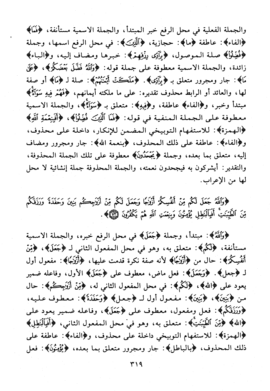والجملة الفعلية في محل الرفع خبر المبتدأ، والجملة الاسمية مستأنفة، {فَمَا} {الفاء}: عاطفة {ما}: حجازية، {الَّذِينَ}: في محل الرفع اسمها، وجملة {فُضِّلُوا} صلة الموصول، {بِرَادِّي رِزْقِهِمْ}: خبرها ومضاف إليه، و {الباء} زائدة، والجملة الاسمية معطوفة على جملة قوله: {وَاللَّهُ فَضَّلَ بَعْضَكُمْ}، {عَلَى مَا}: جار ومجرور متعلق بـ {بِرَادِّي}. {مَلَكَتْ أَيْمَانُهُمْ}: صلة لـ {مَا} أو صفة لها، والعائد أو الرابط محذوف تقديره: على ما ملكته أيمانهم، {فَهُمْ فِيهِ سَوَاءٌ} مبتدأ وخبر، و {الفاء} عاطفة، و {فِيهِ}: متعلق بـ {سَوَاءٌ}، والجملة الاسمية معطوفة على الجملة المنفية في قوله: {فَمَا الَّذِينَ فُضِّلُوا}، {أَفَبِنِعْمَةِ اللَّهِ} {الهمزة}: للاستفهام التوبيخي المضمن للإنكار، داخلة على محذوف، و {الفاء}: عاطفة على ذلك المحذوف، {بنعمة الله}: جار ومجرور ومضاف إليه، متعلق بما بعده، وجملة {يَجْحَدُونَ} معطوفة على تلك الجملة المحذوفة، والتقدير: أيشركون به فيجحدون نعمته، والجملة المحذوفة جملة إنشائية لا محل لها من الإعراب.