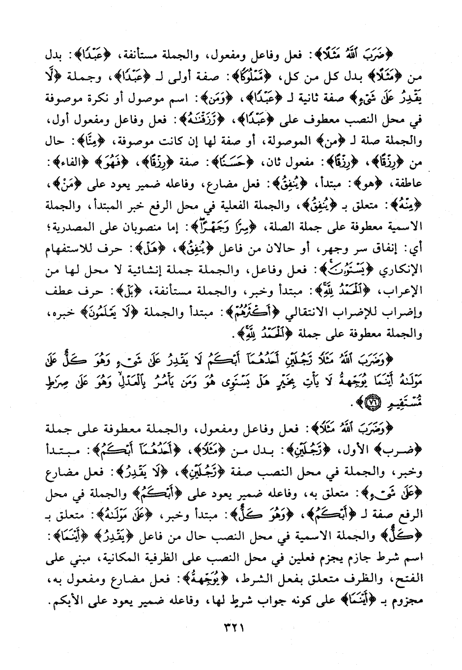 {ضَرَبَ اللَّهُ مَثَلًا}: فعل وفاعل ومفعول، والجملة مستأنفة، {عَبْدًا}: بدل من {مَثَلًا} بدل كل من كل، {مَمْلُوكًا}: صفة أولى لـ {عَبْدًا}، وجملة {لَا يَقْدِرُ عَلَى شَيْءٍ} صفة ثانية لـ {عَبْدًا}، {وَمَن}: اسم موصول أو نكرة موصوفة في محل النصب معطوف على {عَبْدًا}، {رَزَقْنَاهُ}: فعل وفاعل ومفعول أول، والجملة صلة لـ {من} الموصولة، أو صفة لها إن كانت موصوفة، {مِنَّا}: حال من {رِزْقًا}، {رِزْقًا}: مفعول ثان، {حَسَنًا}: صفة {رِزْقًا}، {فَهُوَ} {الفاء}: عاطفة، {هو}: مبتدأ، {يُنْفِقُ}: فعل مضارع، وفاعله ضمير يعود على {مَنْ}، {مِنْهُ}: متعلق بـ {يُنْفِقُ}، والجملة الفعلية في محل الرفع خبر المبتدأ، والجملة الاسمية معطوفة على جملة الصلة، {سرا وجهرا}: إما منصوبان على المصدرية؛ أي: إنفاق سر وجهر، أو حالان من فاعل {يُنْفِقُ}، {هَلْ}: حرف للاستفهام الإنكاري {يَسْتَوُونَ}: فعل وفاعل، والجملة جملة إنشائية لا محل لها من الإعراب، {الْحَمْدُ لِلَّهِ}: مبتدأ وخبر، والجملة مستأنفة، {بَلْ}: حرف عطف وإضراب للإضراب الانتقالي {أَكْثَرُهُمْ}: مبتدأ والجملة {لَا يَعْلَمُونَ} خبره، والجملة معطوفة على جملة {الْحَمْدُ لِلَّهِ}.
