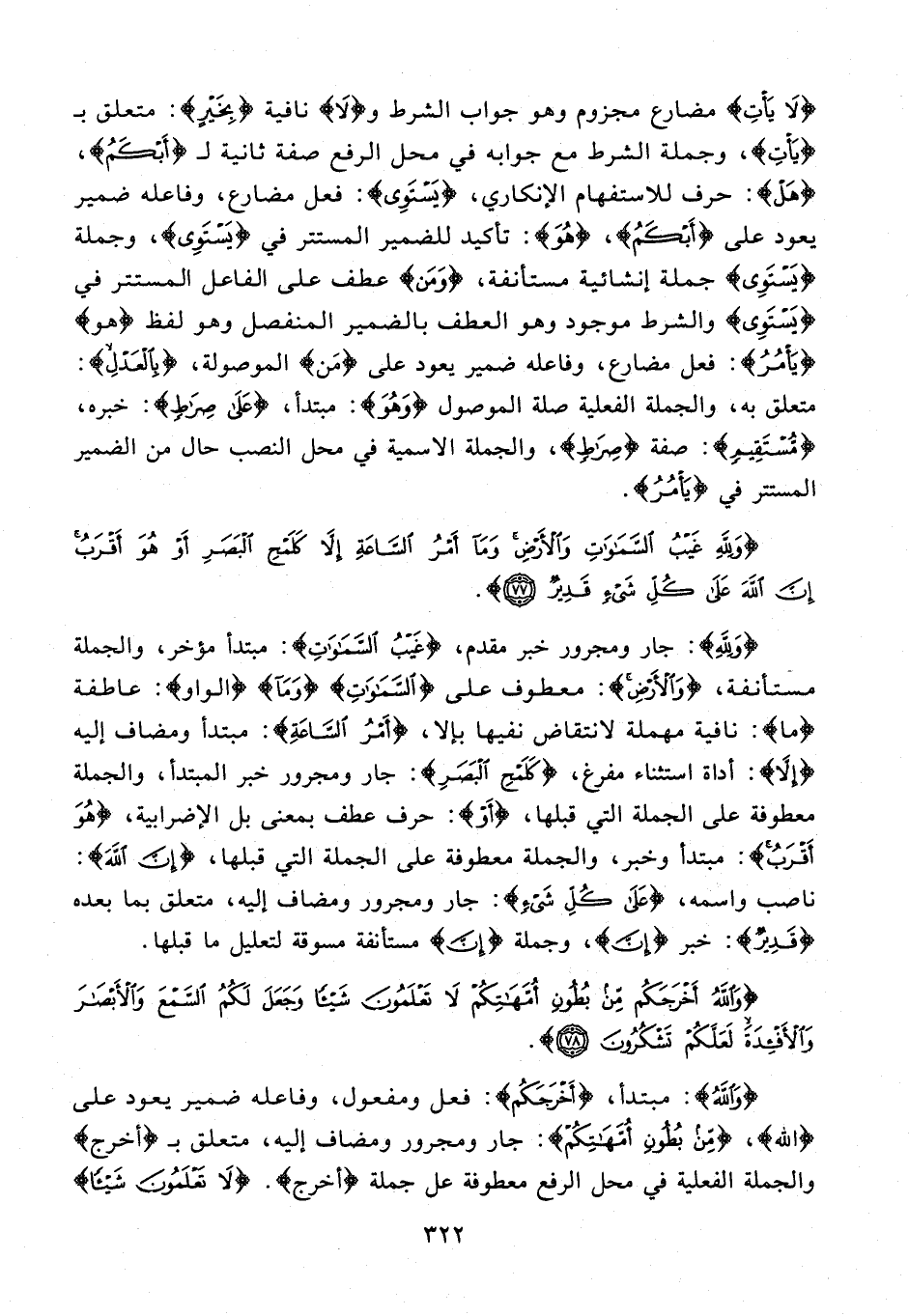 {وَلِلَّهِ}: جار ومجرور خبر مقدم، {غَيْبُ السَّمَاوَاتِ}: مبتدأ مؤخر، والجملة مستأنفة، {وَالْأَرْضِ}: معطوف على {السَّمَاوَاتِ} {وَمَاَ} {الواو}: عاطفة {ما}: نافية مهملة لانتقاض نفيها بإلا، {أَمْرُ السَّاعَةِ}: مبتدأ ومضاف إليه {إِلَّا}: أداة استثناء مفرغ، {كَلَمْحِ الْبَصَرِ}: جار ومجرور خبر المبتدأ، والجملة معطوفة على الجملة التي قبلها، {أَوْ}: حرف عطف بمعنى بل الإضرابية، {هُوَ أَقْرَبُ}: مبتدأ وخبر، والجملة معطوفة على الجملة التي قبلها، {إِنَّ اللَّهَ}: ناصب واسمه، {عَلَى كُلِّ شَيْءٍ}: جار ومجرور ومضاف إليه، متعلق بما بعده {قَدِيرٌ}: خبر {إِنَّ}، وجملة {إِنَّ} مستأنفة مسوقة لتعليل ما قبلها.