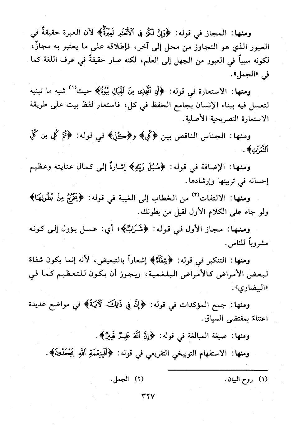 ومنها: المجاز في قوله: {وَإِنَّ لَكُمْ فِي الْأَنْعَامِ لَعِبْرَةً} لأن العبرة حقيقةٌ في العبور الذي هو التجاوز من محل إلى آخر، فإطلاقه على ما يعتبر به مجازٌ، لكونه سببًا في العبور من الجهل إلى العلم، لكنه صار حقيقةً في عرف اللغة كما في "الجمل".