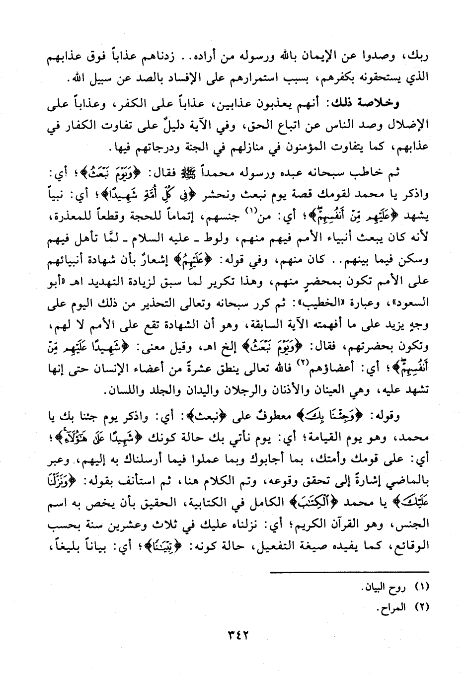 89 - ثم خاطب سبحانه عبده ورسوله محمدًا - صلى الله عليه وسلم - فقال: {وَيَوْمَ نَبْعَثُ}؛ أي: واذكر يا محمَّد لقومك قصة يوم نبعث ونحشر {فِي كُلِّ أُمَّةٍ شَهِيدًا}؛ أي: نبيًّا يشهد {عَلَيْهِمْ مِنْ أَنْفُسِهِمْ}؛ أي: من (¬1) جنسهم، إتمامًا للحجة وقطعًا للمعذرة، لأنه كان يبعث أنبياء الأمم فيهم منهم، ولوط - عليه السلام - لمَّا تأهل فيهم وسكن فيما بينهم .. كان منهم، وفي قوله: {عَلَيْهِمْ} إشعارٌ بأن شهادة أنبيائهم على الأمم تكون بمحضرٍ منهم، وهذا تكرير لما سبق لزيادة التهديد اهـ "أبو السعود"، وعبارة "الخطيب": ثم كرر سبحانه وتعالى التحذير من ذلك اليوم على وجهٍ يزيد على ما أفهمته الآية السابقة، وهو أن الشهادة تقع على الأمم لا لهم، وتكون بحضرتهم، فقال: {وَيَوْمَ نَبْعَثُ} إلخ اهـ، وقيل معنى: {شَهِيدًا عَلَيْهِمْ مِنْ أَنْفُسِهِمْ}؛ أي: أعضاؤهم (¬2) فالله تعالى ينطق عشرةً من أعضاء الإنسان حتى إنها تشهد عليه، وهي العينان والأذنان والرجلان واليدان والجلد واللسان.