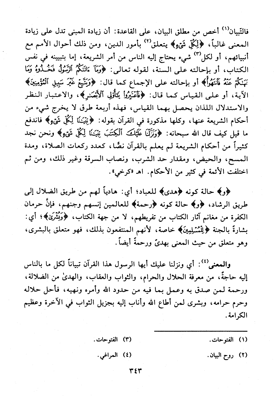 فالتّبيان (¬1) أخص من مطلق البيان، على القاعدة: أن زيادة المبنى تدل على زيادة المعنى غالبًا، {لِكُلِّ شَيْءٍ} يتعلق (¬2) بأمور الدين، ومن ذلك أحوال الأمم مع أنبيائهم، أو لكل (¬3) شيء يحتاج إليه الناس من أمر الشريعة، إما بتبيينه في نفس الكتاب، أو بحالته على السنة، لقوله تعالى: {وَمَا آتَاكُمُ الرَّسُولُ فَخُذُوهُ وَمَا نَهَاكُمْ عَنْهُ فَانْتَهُوا} أو بإحالته على الإجماع كما قال: {وَيَتَّبِعْ غَيْرَ سَبِيلِ الْمُؤْمِنِينَ} الآية، أو على القياس كما قال: {فاعتبروا يا أولي الأبصار}، والاعتبار النظر والاستدلال اللذان يحصل بهما القياس، فهذه أربعة طرق لا يخرج شيء من أحكام الشريعة عنها، وكلها مذكورة في القرآن بقوله: {تِبْيَانًا لِكُلِّ شَيْءٍ}: فاندفع ما قيل كيف قال الله سبحانه: {وَنَزَّلْنَا عَلَيْكَ الْكِتَابَ تِبْيَانًا لِكُلِّ شَيْءٍ}: ونحن نجد كثيرًا من أحكام الشريعة لم يعلم بالقرآن نصًّا، كعدد ركعات الصلاة، ومدة المسح، والحيض، ومقدار حد الشرب، ونصاب السرقة وغير ذلك، ومن ثم اختلفت الأئمة في كثير من الأحكام. اهـ "كرخي".